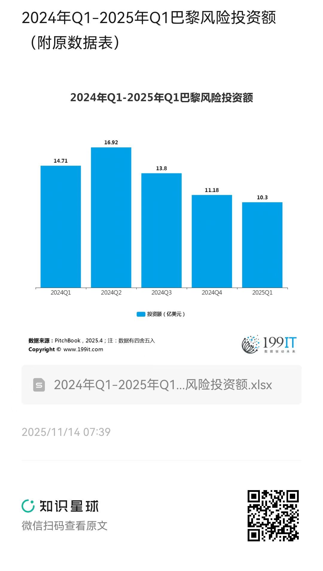 2024年Q1-2025年Q1巴黎风险投资额(附原数据表) ​​​