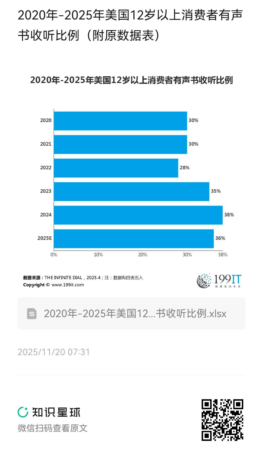 - 2020年-2025年美国12岁以上消费者周度在线音频收听比例(附原数据表)