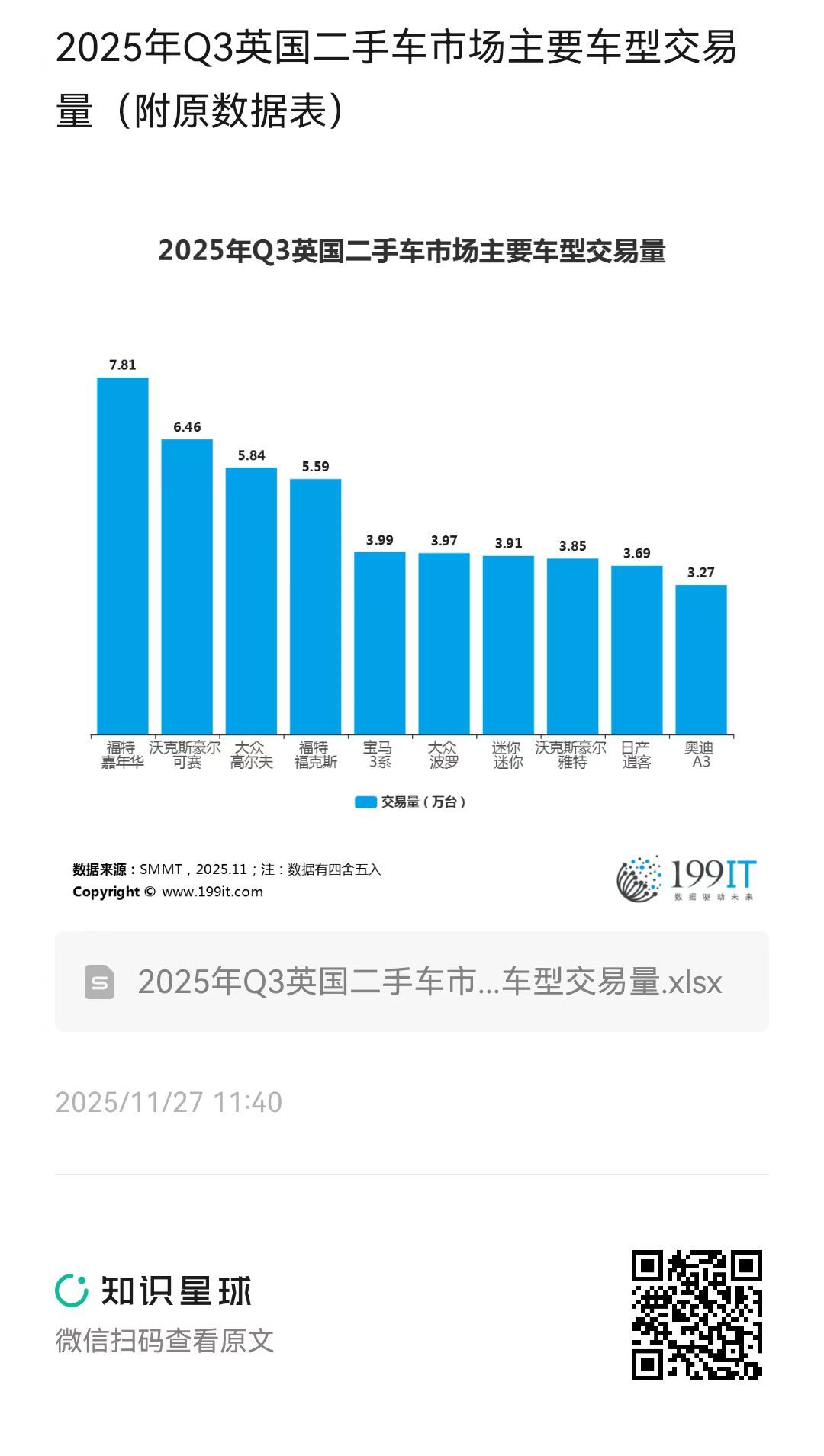 2025年Q3英国二手车市场主要车型交易量(附原数据表) 更多阅读:2023年Q1英国最畅销二手车型销量(附原数据表) 2024年Q3英国二手车市场主要地区销量(附原数据表) 中国汽车流通协会:2020年11月二手车市场深度分析中国汽车流通协会:2024年6月全国二手车市场深度分析中国汽车流通协会:2024年4月全国二手车市场深度分析中国汽车流通协会:2023年8月全国二手车市场深度分析中国汽车流通协会:2023年7月全国二手车市场深度分析SUTA:2023年7月上海市二手车市场简析中国汽车流通协会:2022年2月全国二手车市场深度分析中国汽车流通协会:经销商集团二手车业务分析中国汽车流通协会:2021年5月份中国二手车经理人指数为48.1%中国汽车流通协会:2021年2月二手车市场简析中国汽车流通协会:2021年1月全国二手车市场深度分析中国汽车流通协会:2021年1月二手车市场简析Treuhand GmbH:2020年德国汽车消费者调查