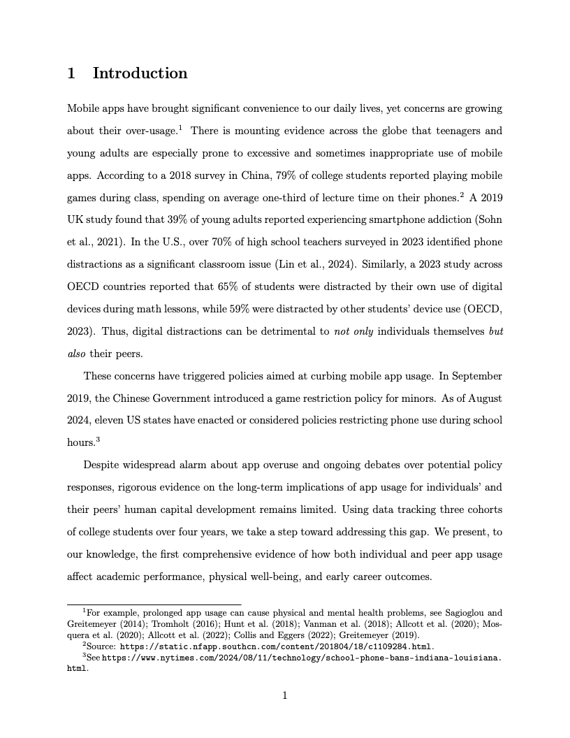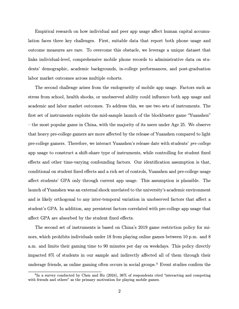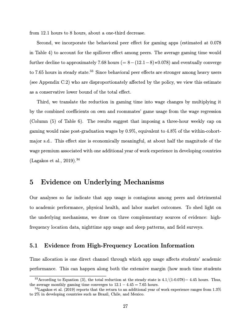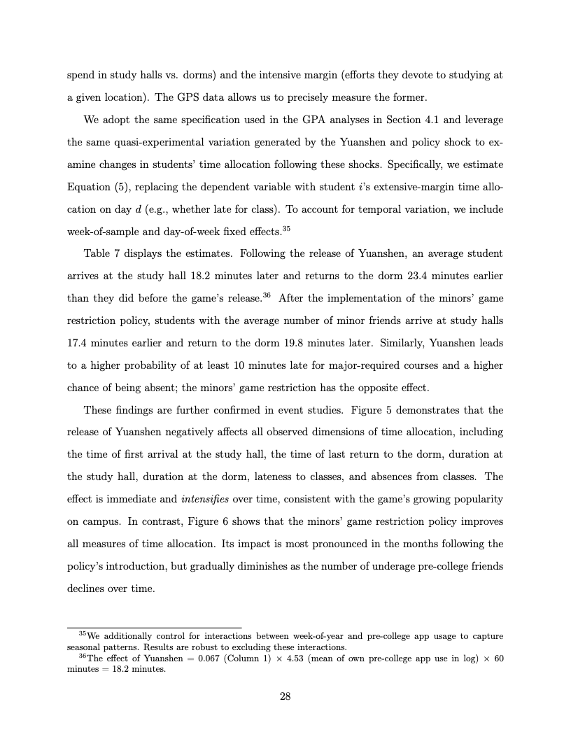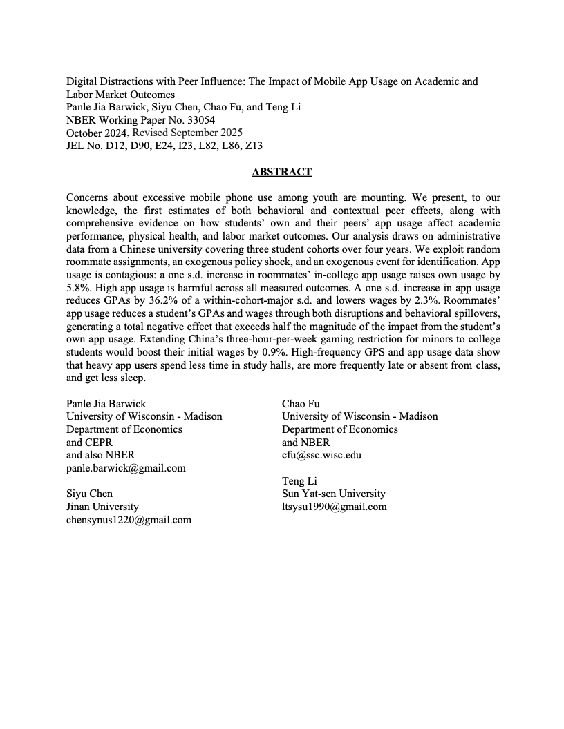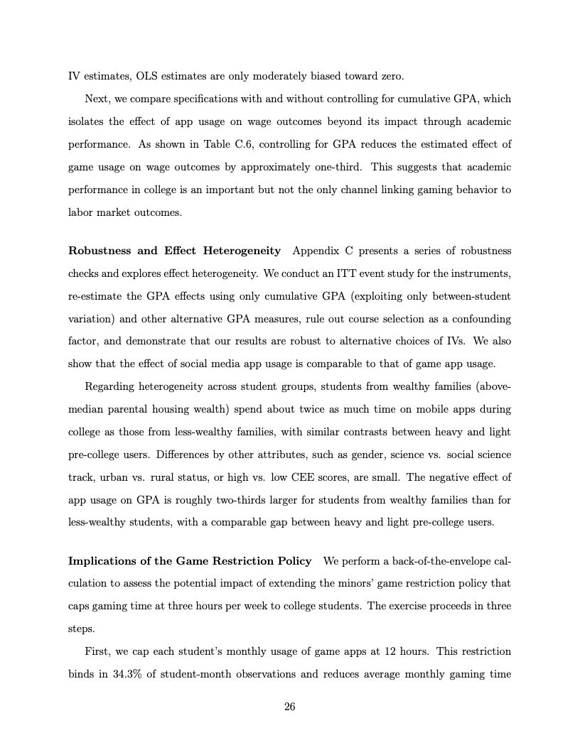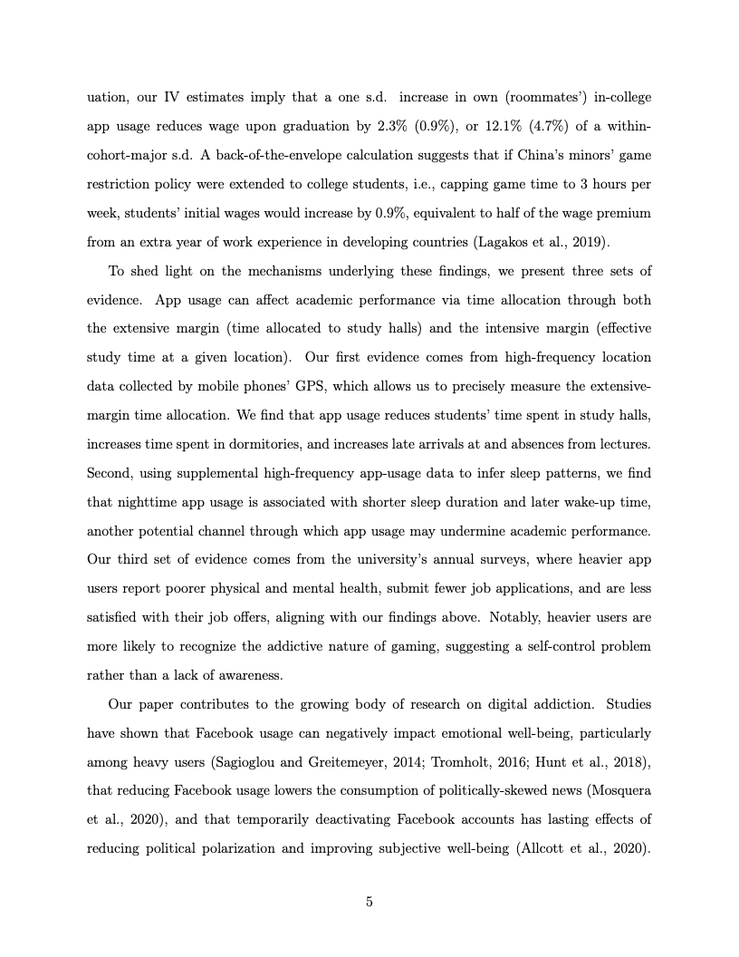 对就业影响:一标准差的个人应用使用上升关联毕业初始工资下降约2.3%;室友使用上升造成约0.9%的工资下降。若把未成年人每周限玩三小时的政策扩展到大学生,估计可将毕业初薪提高约0.9%。