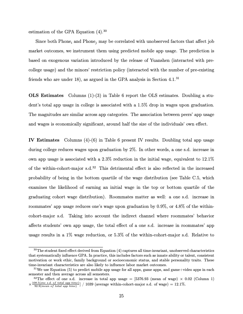 对学业影响:工具变量估计显示,本人移动应用使用每增加一标准差,必修课程GPA下降约36.2%(以同专业组内标准差计);室友使用的总合效应相当于GPA下降约22.7%,超出本人影响的一半。对体能课(PE)影响更大:一标准差使用增加使PE成绩下降约2.74分,约为对必修GPA影响的三至四倍。