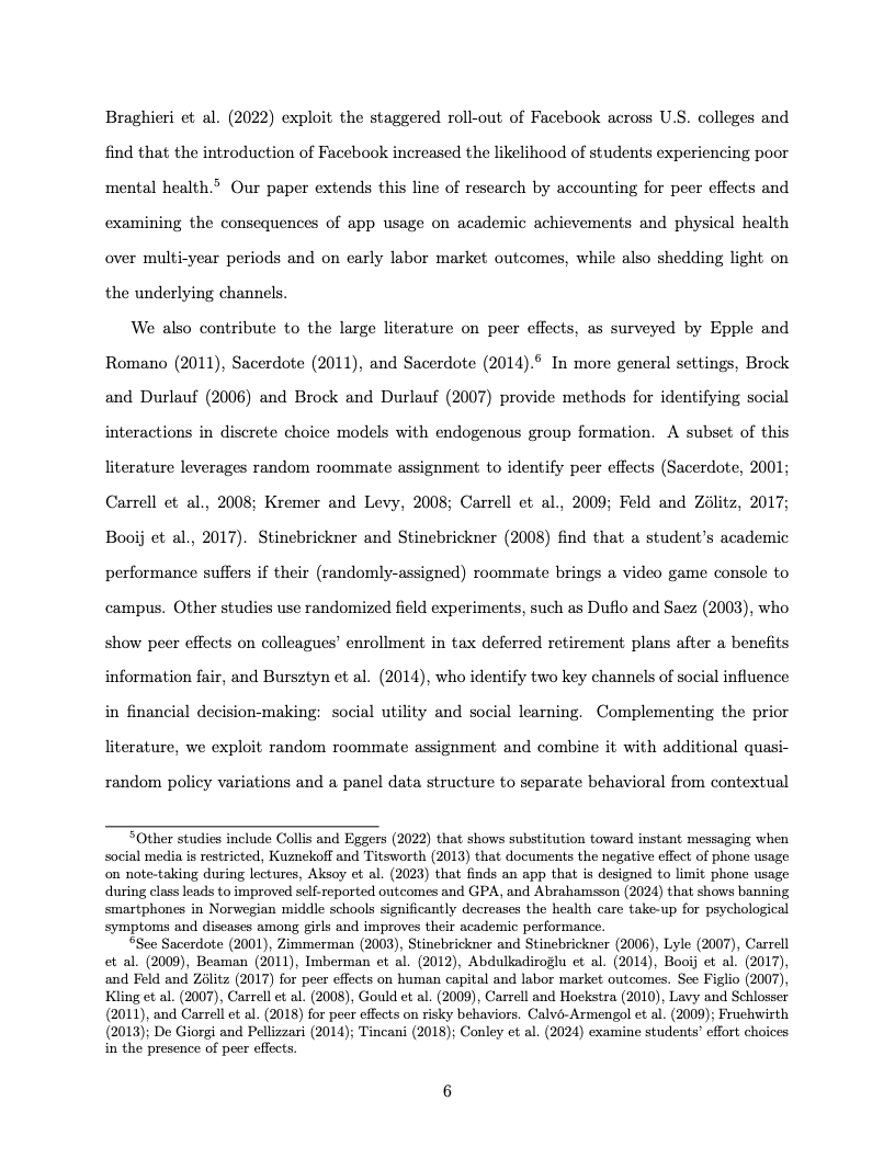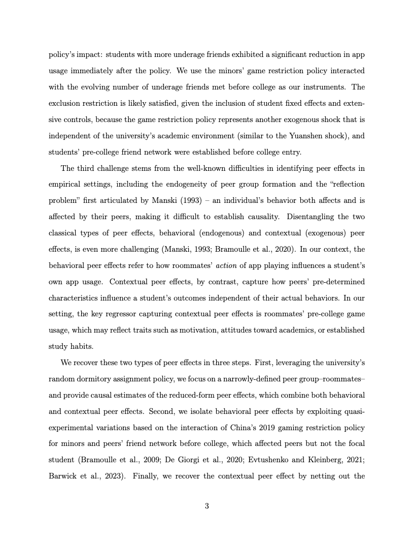 经随机寝室分配与外生政策冲击辨识,发现同伴行为具显著传染性:室友应用使用量每增加一标准差,个人使用增加约5.8%。行为溢出主导于同伴影响,室友特征本身的情境效应小且不显著。