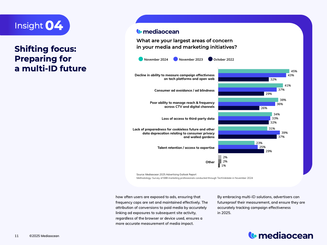 然而,数字化的深入也带来了新的挑战。衡量营销活动有效性的能力下降(45%)已成为业界最首要的担忧。同时,消费者对广告的回避(41%)以及跨平台管理触达与频次的困难(38%)同样严峻。在广告验证方面,尽管符合MRC标准的衡量与报告(32%)依然重要,但利用数据进行实时决策的“可操作性”(28%)需求正快速增长,凸显了市场从被动监测向主动优化的转变。
