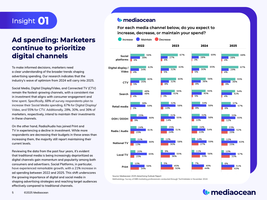 根据对近700名营销专业人士的调研,2025年的广告业正迎来一场深刻的结构性变革。数字渠道的霸主地位愈发稳固,其中社交媒体以68%的营销人员计划增加投入的压倒性优势,继续领跑广告预算分配。数字展示与视频广告(67%)及联网电视(CTV, 55%)紧随其后,这三大渠道构成了增长的核心引擎。与此形成鲜明对比的是,传统广播、电视及平面媒体的预算则持续面临削减压力。