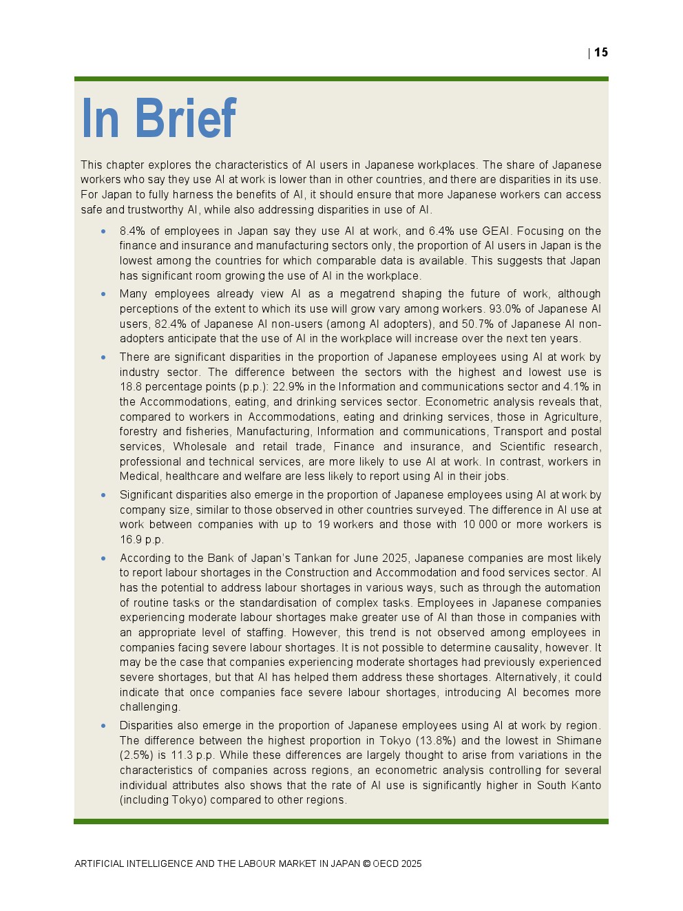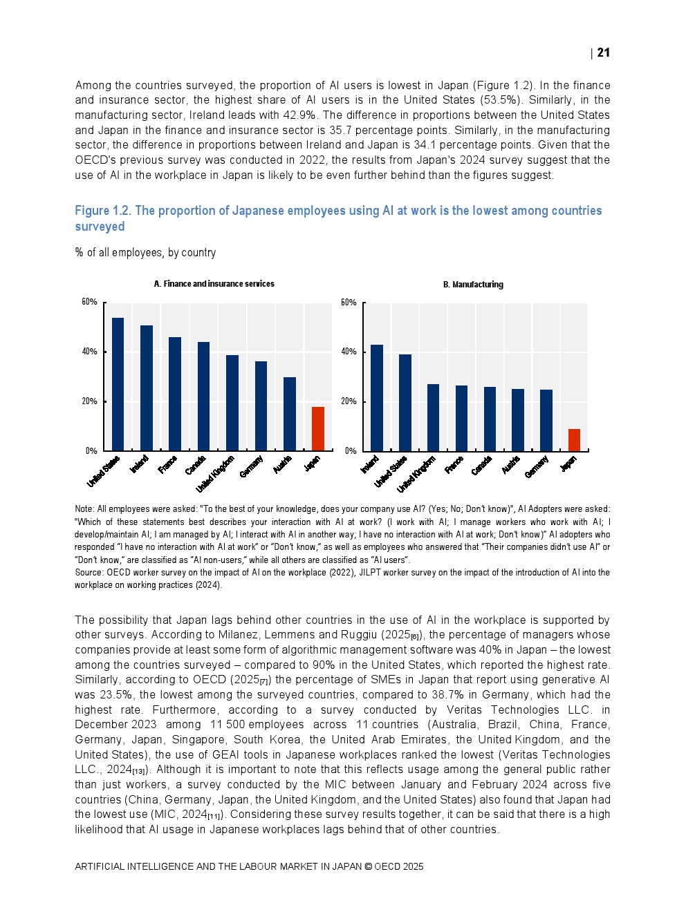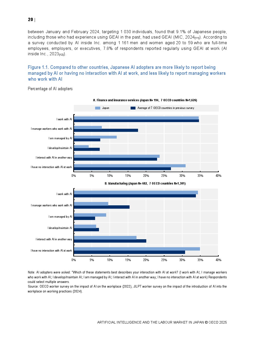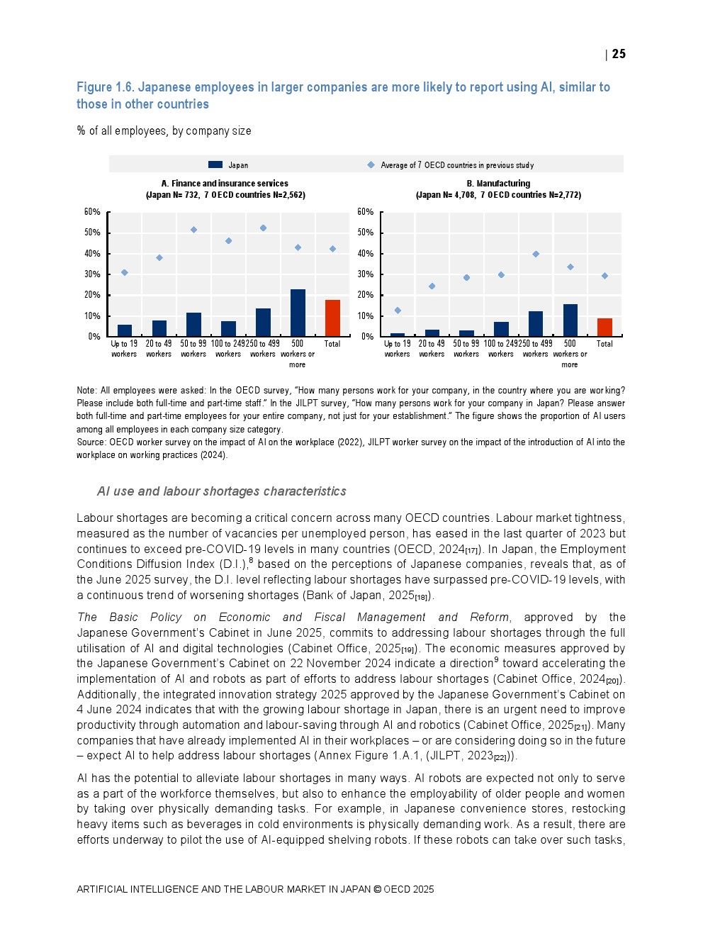 日本正同时面对人口老龄化与劳动力持续收缩的双重约束。OECD数据显示,日本整体AI在职场中的使用率仅为8.4%,显著低于其他经合组织国家,在制造业和金融保险业中差距尤为明显。这一低渗透率意味着日本尚未充分释放AI提升劳动生产率与改善工作环境的潜力,也使其在国际比较中处于明显滞后位置。