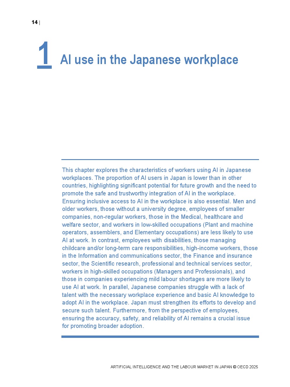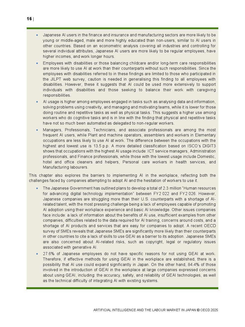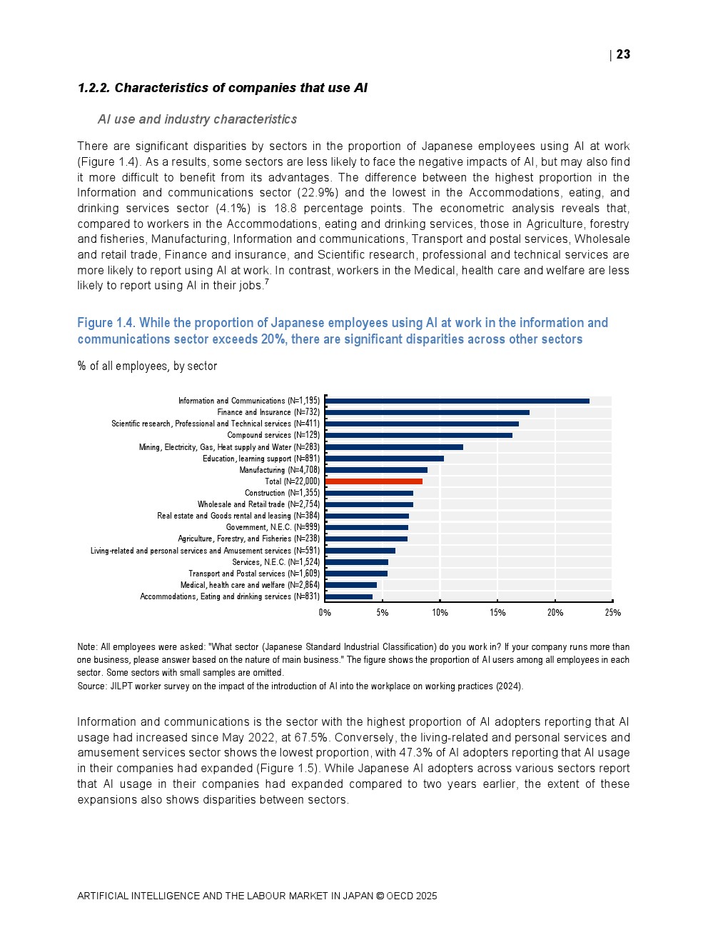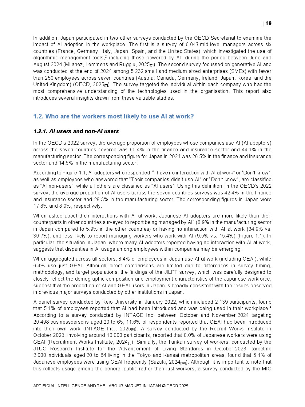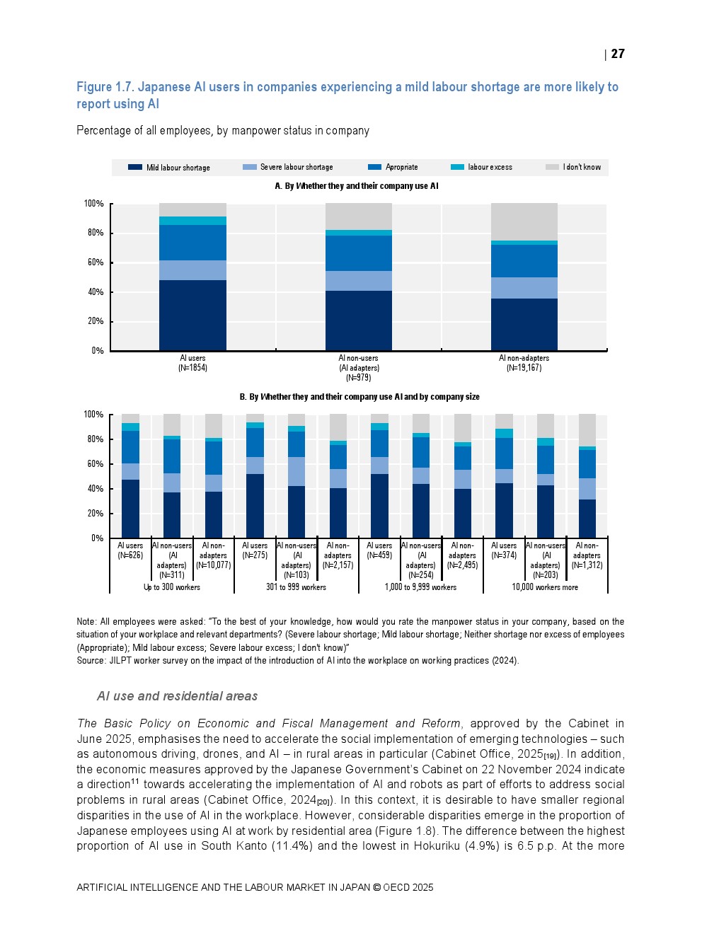 日本正同时面对人口老龄化与劳动力持续收缩的双重约束。OECD数据显示,日本整体AI在职场中的使用率仅为8.4%,显著低于其他经合组织国家,在制造业和金融保险业中差距尤为明显。这一低渗透率意味着日本尚未充分释放AI提升劳动生产率与改善工作环境的潜力,也使其在国际比较中处于明显滞后位置。