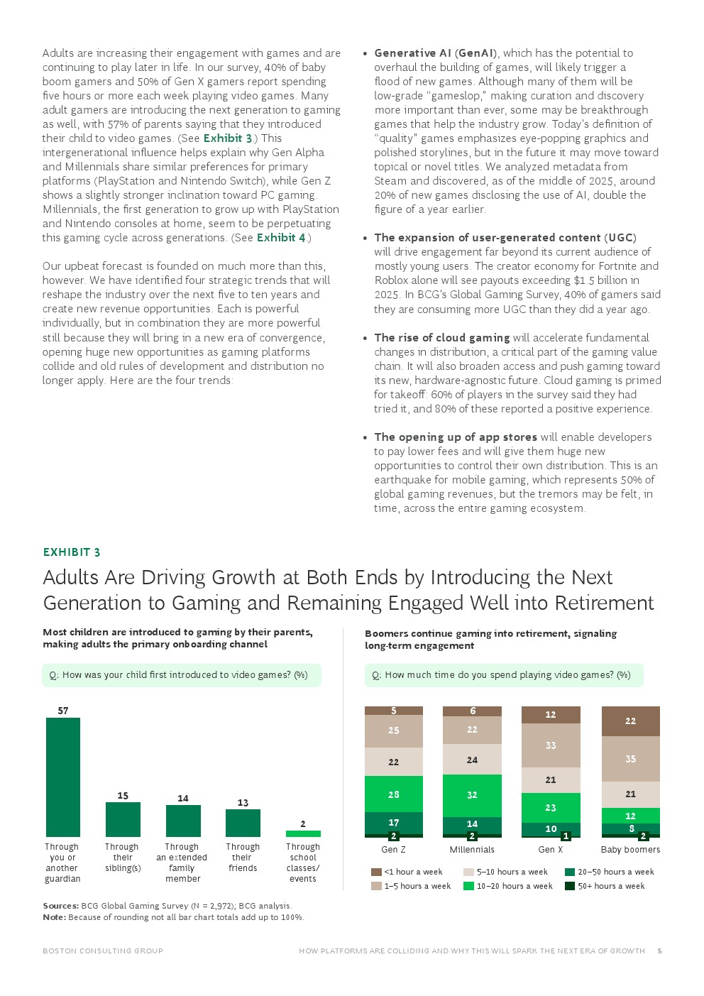 成年玩家的参与度也在提升且持续时间更长。调查中,40%的婴儿潮一代玩家和50%的X世代玩家每周游戏时间超过五小时。许多成年玩家还引导下一代加入游戏,57%的家长表示是他们让孩子接触了电子游戏。