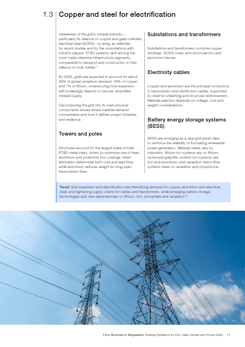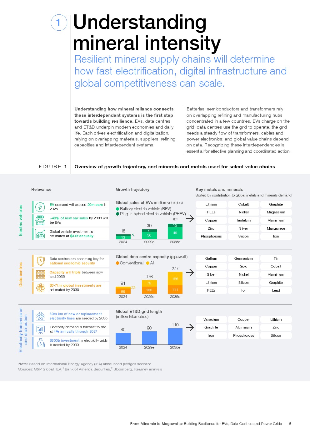 全球电动化与数字化进程正在同步提速。报告显示,2025年全球电动汽车销量将超过2000万辆,2030年新车销售中超过40%为电动车,2035年销量或达3900万辆。数据中心容量预计到2035年增长至277GW,较当前规模提升逾三倍。电网方面,至2035年全球需新增或更换约6000万公里输电线路,年均电力需求增速维持在4%左右。这三大体系共同拉动铜、铝、锂、稀土等关键金属需求进入高弹性阶段。