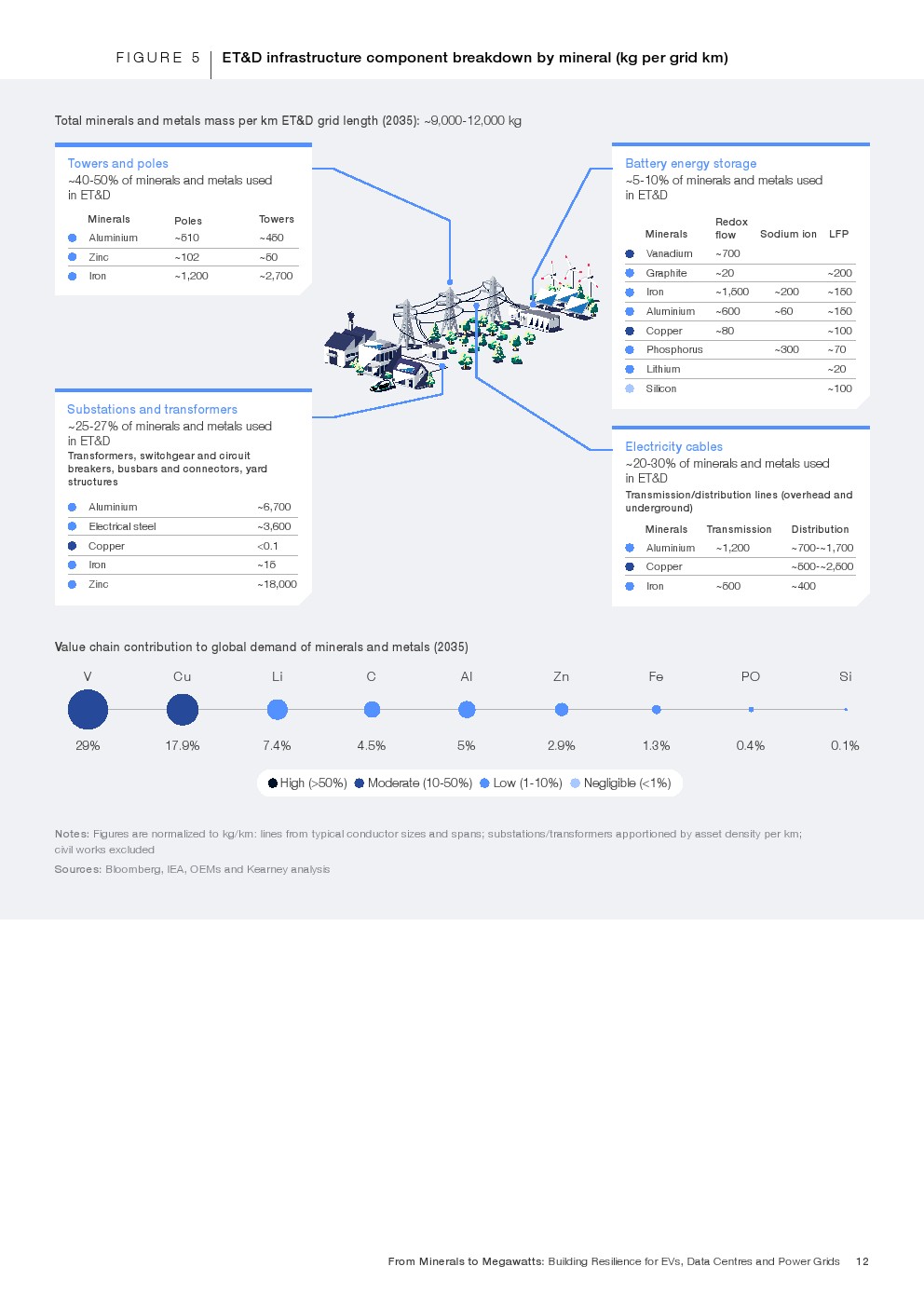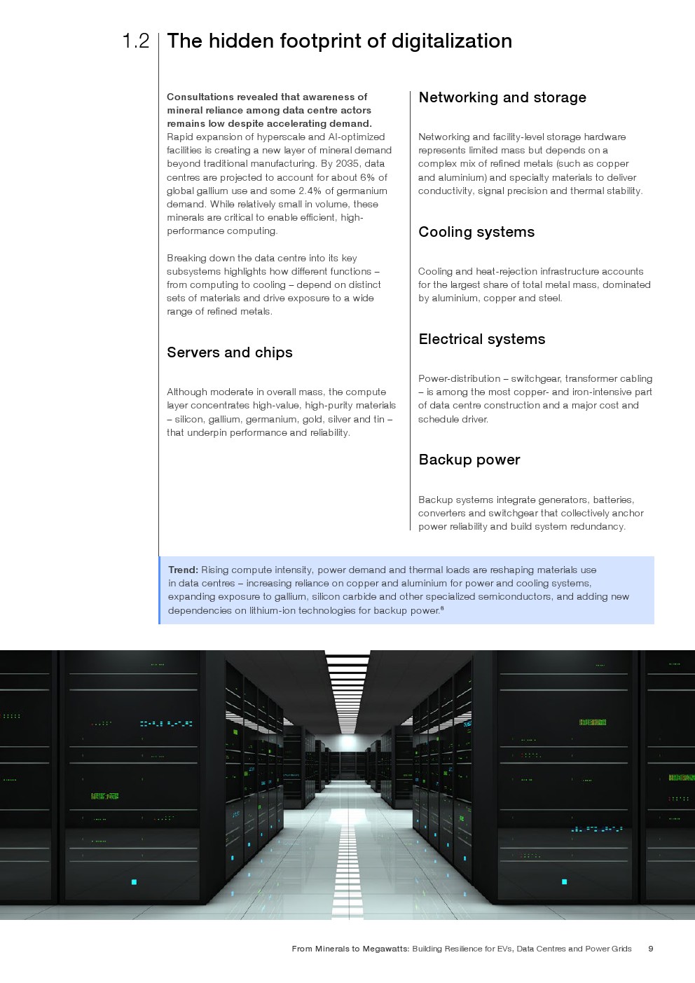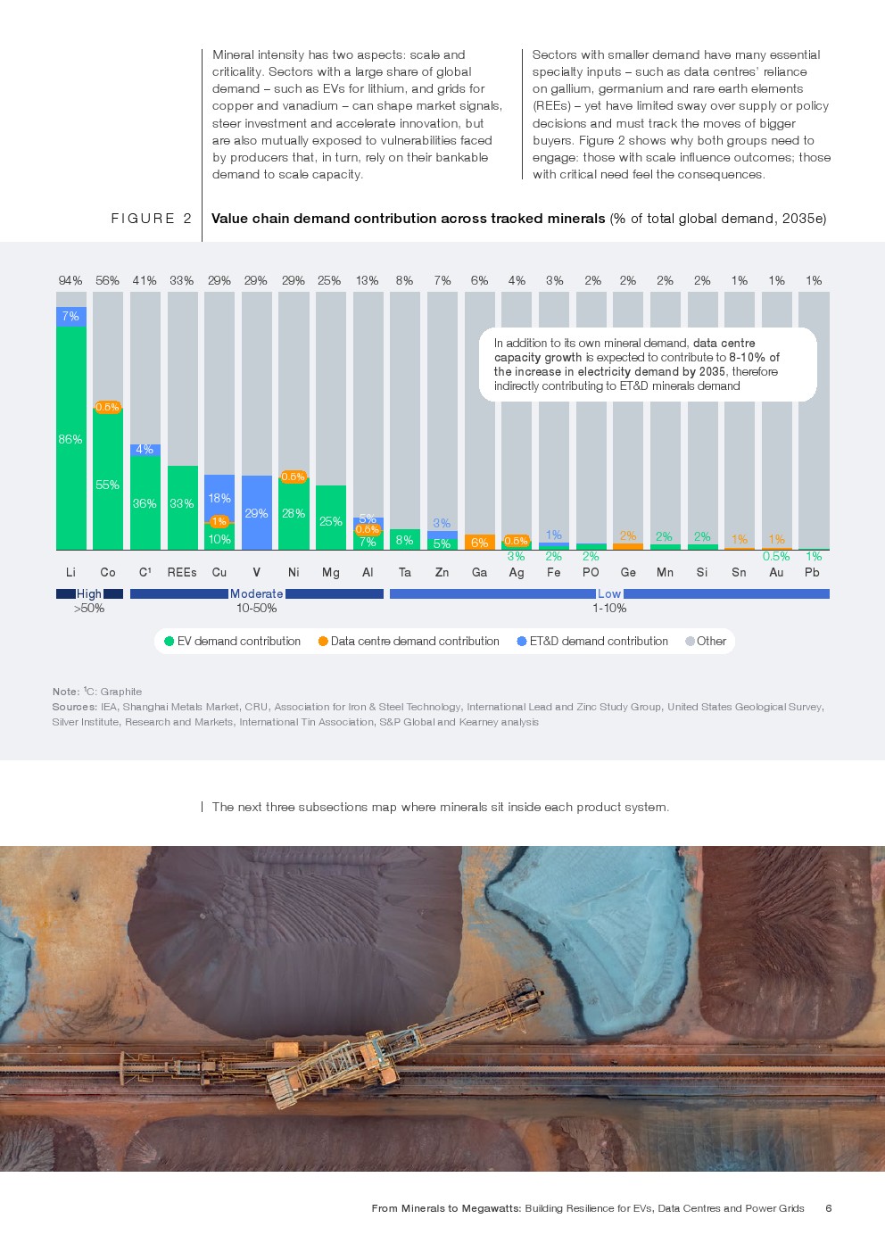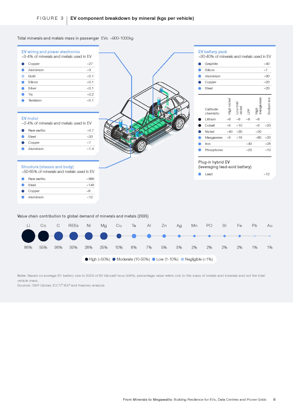 矿产强度结构呈现高度集中特征。到2035年,电动车将消耗全球86%的锂、55%的钴及33%的稀土需求。电网系统预计占全球钒需求的29%、铜的约18%。数据中心虽体量相对较小,但将占全球镓需求6%、锗需求2.4%。其中,一辆纯电动车所含金属总量约900至1000公斤,电池占比30%至40%;而每兆瓦数据中心建设需消耗约60至75吨金属材料,冷却与供配电系统为主要用量来源。金属需求的叠加,使三大价值链在上游形成高度耦合。