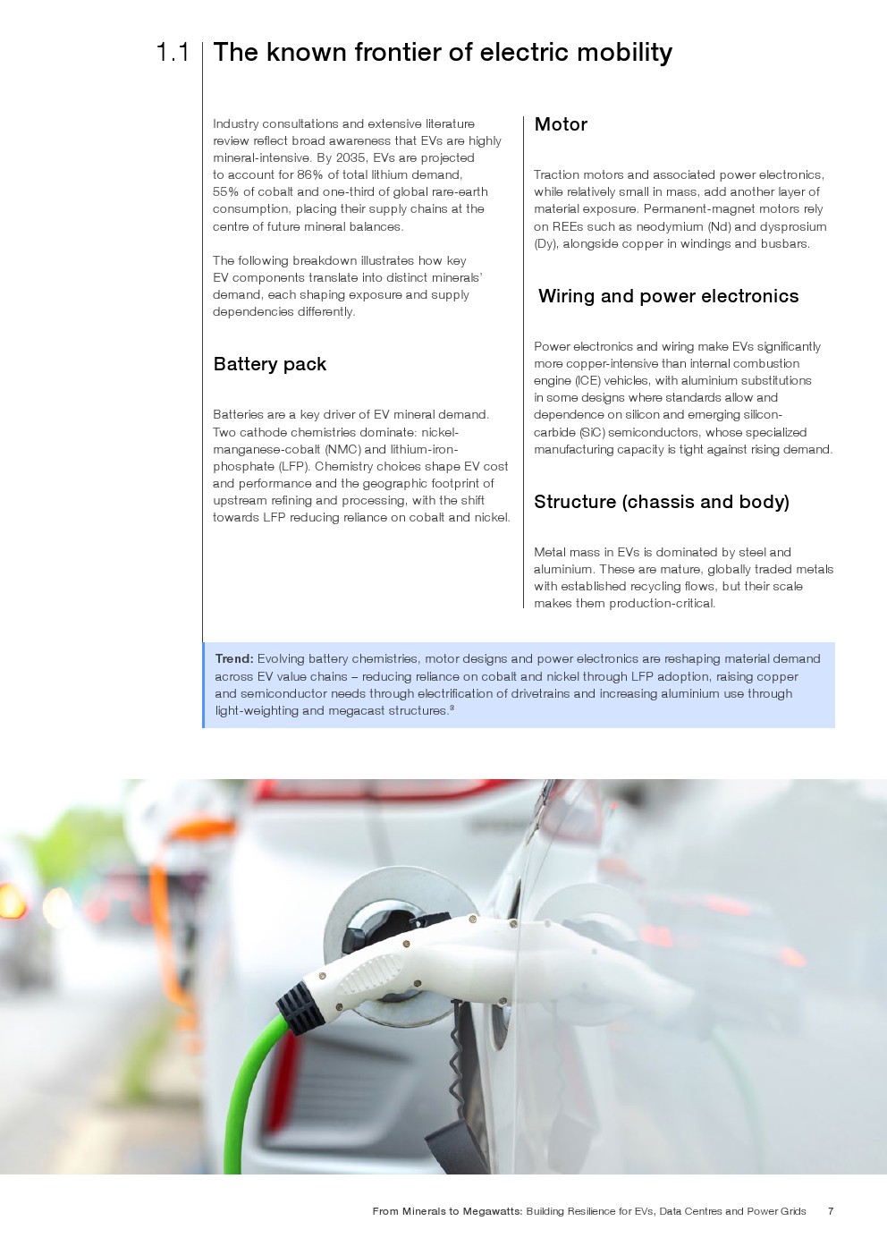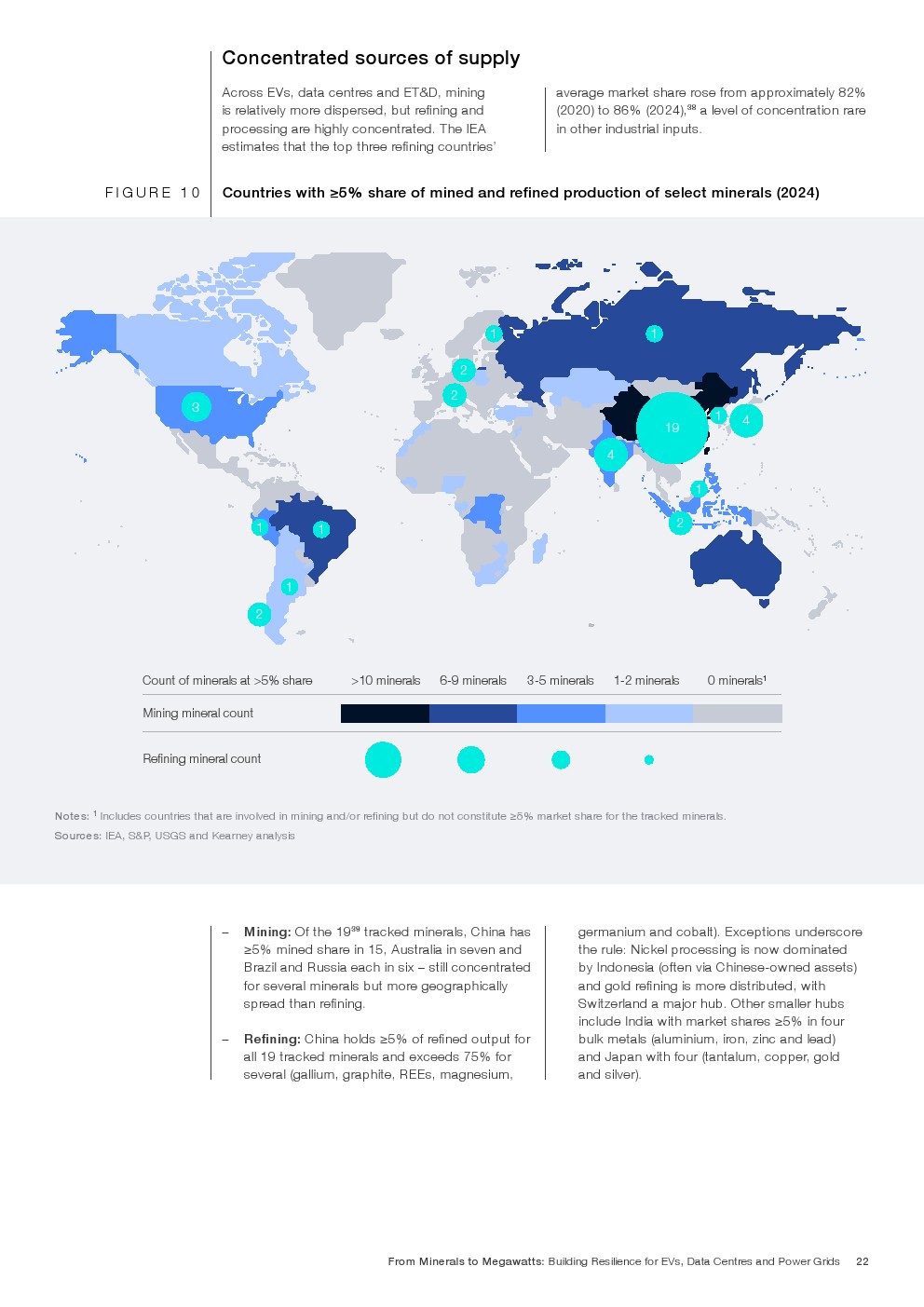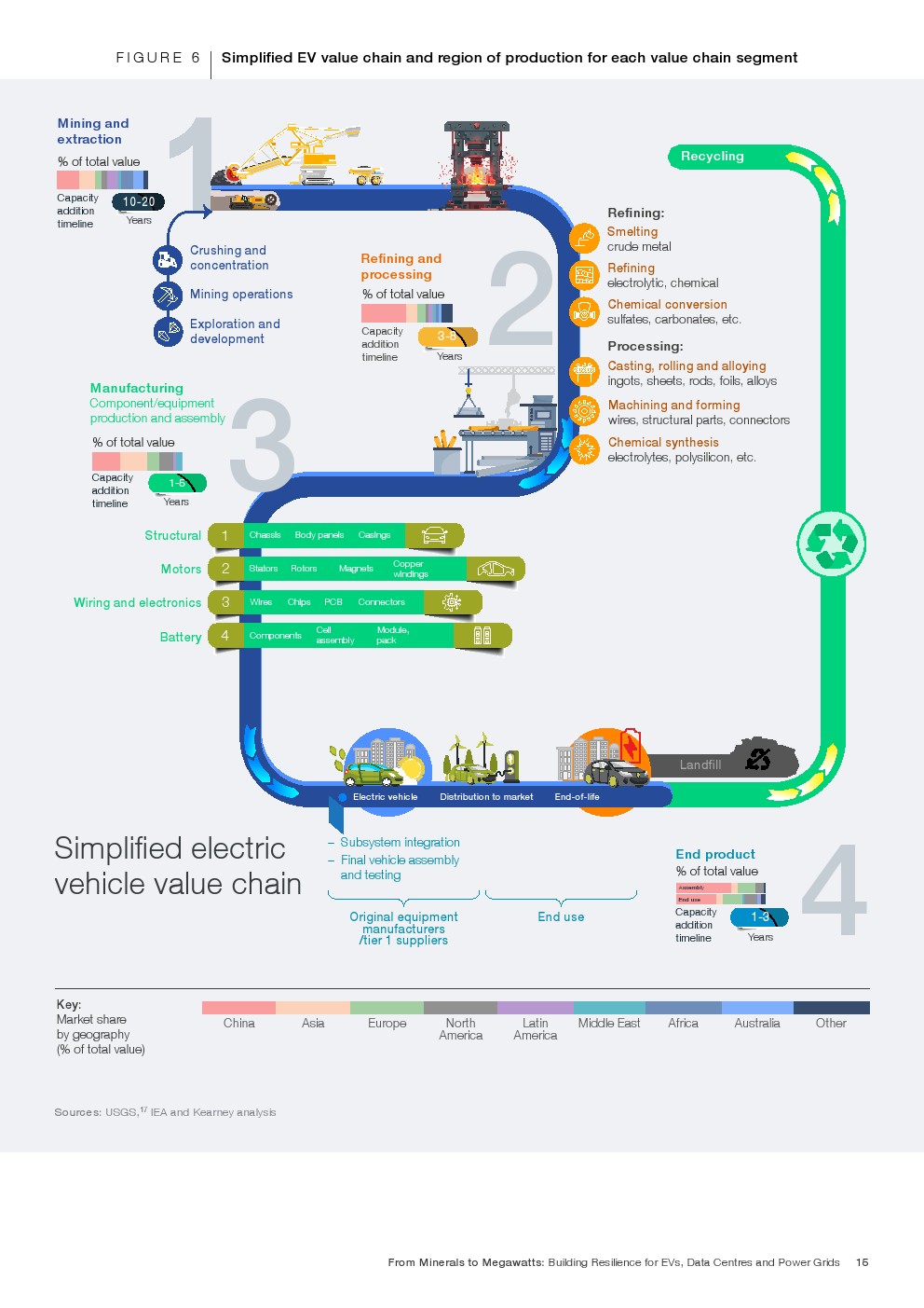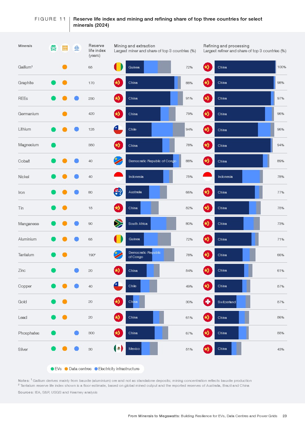 矿产强度结构呈现高度集中特征。到2035年,电动车将消耗全球86%的锂、55%的钴及33%的稀土需求。电网系统预计占全球钒需求的29%、铜的约18%。数据中心虽体量相对较小,但将占全球镓需求6%、锗需求2.4%。其中,一辆纯电动车所含金属总量约900至1000公斤,电池占比30%至40%;而每兆瓦数据中心建设需消耗约60至75吨金属材料,冷却与供配电系统为主要用量来源。金属需求的叠加,使三大价值链在上游形成高度耦合。