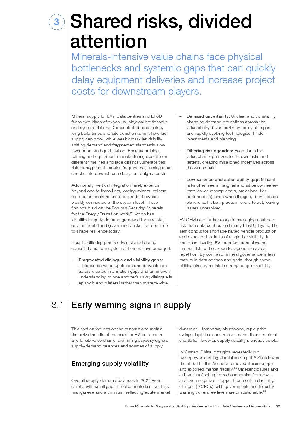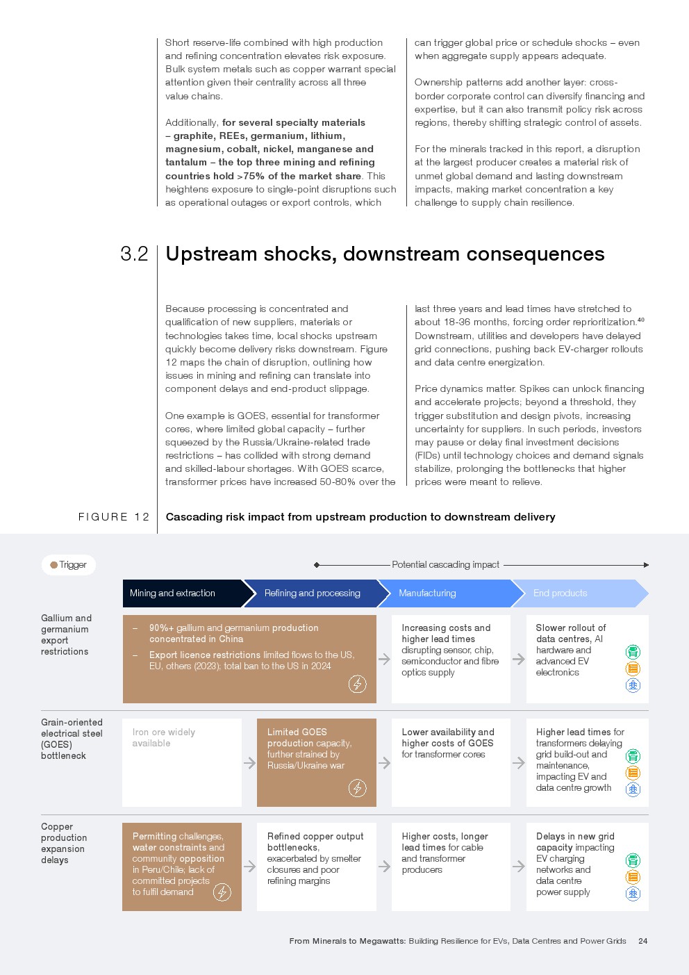 上游冲击已向下游传导。以电工钢为例,受地缘政治与产能限制影响,过去三年价格上涨50%至80%,交付周期延长至18至36个月,直接推迟变压器交付与电网接入。镓、锗出口限制亦抬高芯片与光电子成本,影响数据中心与高端电动车生产节奏。价格剧烈波动在一定程度上刺激投资,但当不确定性过高时,反而推迟最终投资决策,形成自我强化的供需紧张循环。