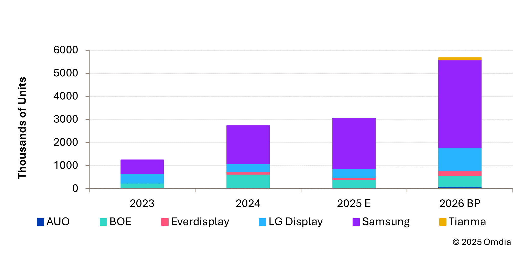 展望2026年,增量需求预计将主要由欧洲原始设备制造商驱动。三星显示预计将保持其领导地位,而随着更多项目进入量产,LG显示的市场份额预计将增加。
