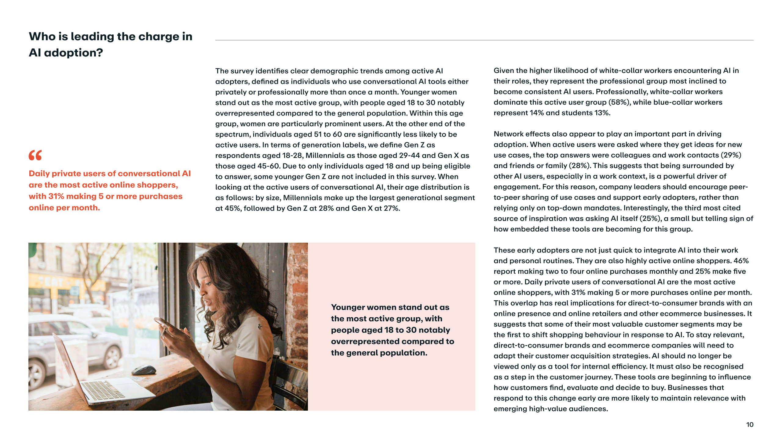 从人群结构看,AI的早期采用者呈现出明显画像特征。18至30岁的年轻女性是最活跃的群体,千禧一代在活跃用户中占比最高,达45%,其次为Z世代28%和X世代27%。职业上,58%的活跃用户为白领人群。值得注意的是,日常在私人场景中使用AI的用户同时也是最活跃的线上消费者,31%每月网购五次以上,显示AI采用与高消费活跃度之间存在显著相关性。