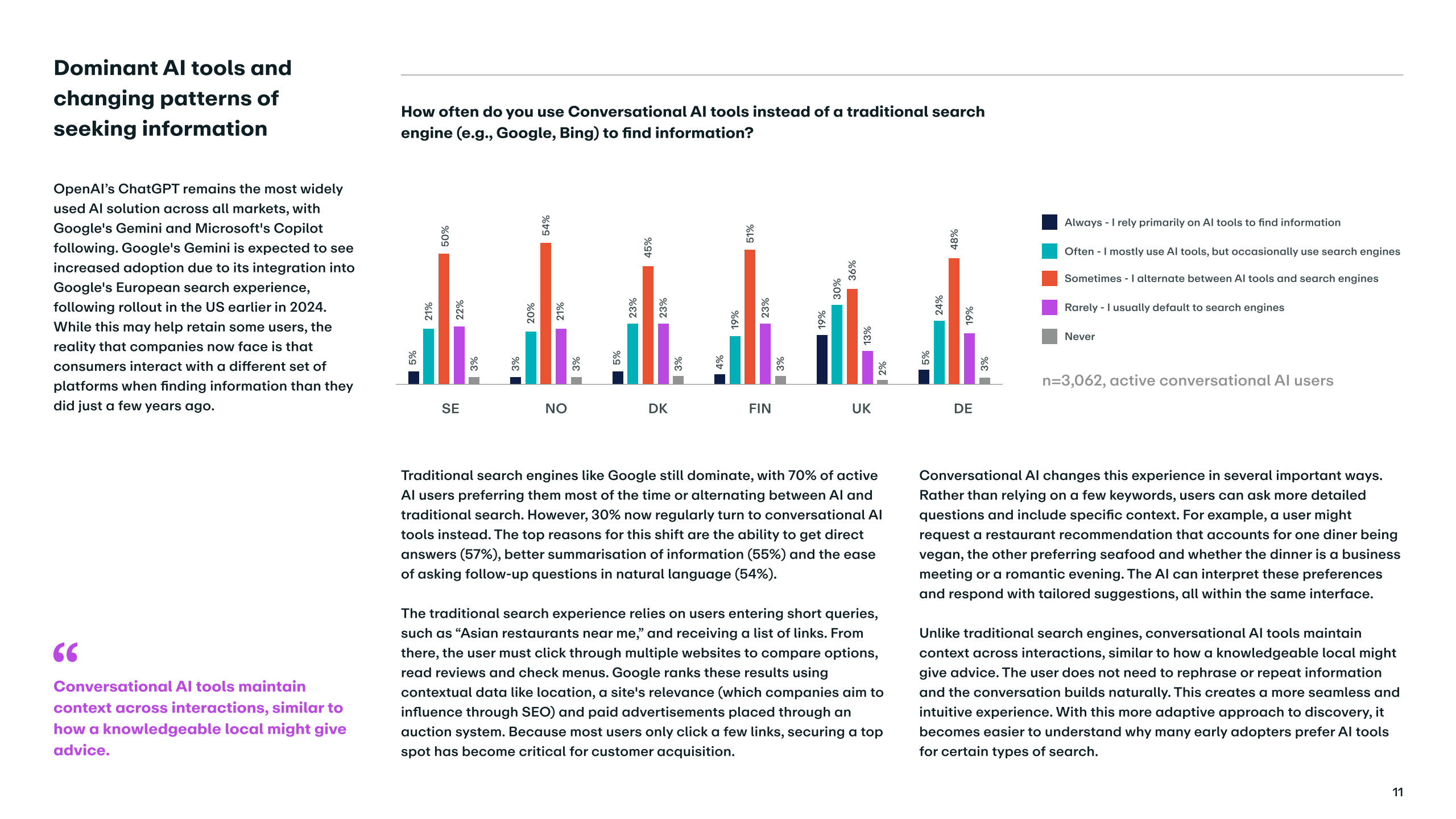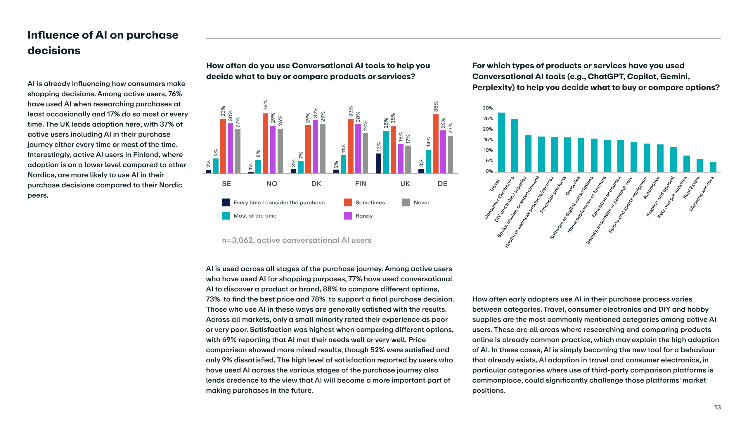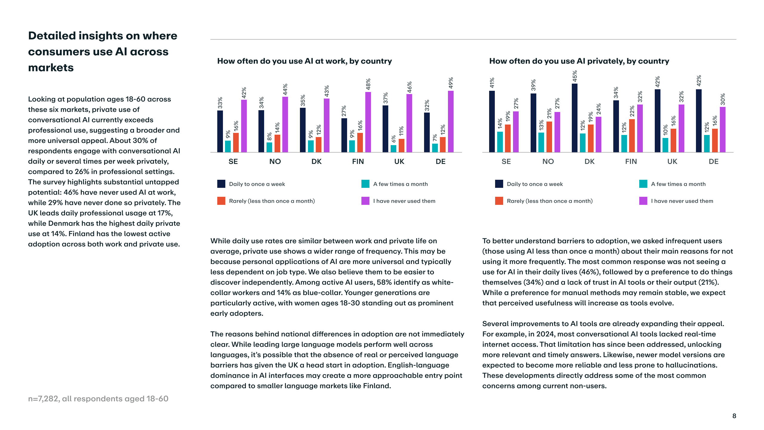 从国家层面看,英国在工作场景的日常使用率上领先,达到17%,而丹麦在私人日常使用上居首,比例为14%。芬兰在工作与私人两端均处于低位,活跃采用率分别为37%与46%。约30%的受访者在私人生活中每天或每周多次使用AI,而在工作中这一比例为26%。与此同时,仍有46%的消费者从未在工作中使用过AI,29%从未在私人场景中使用,显示出显著的未被开发空间。