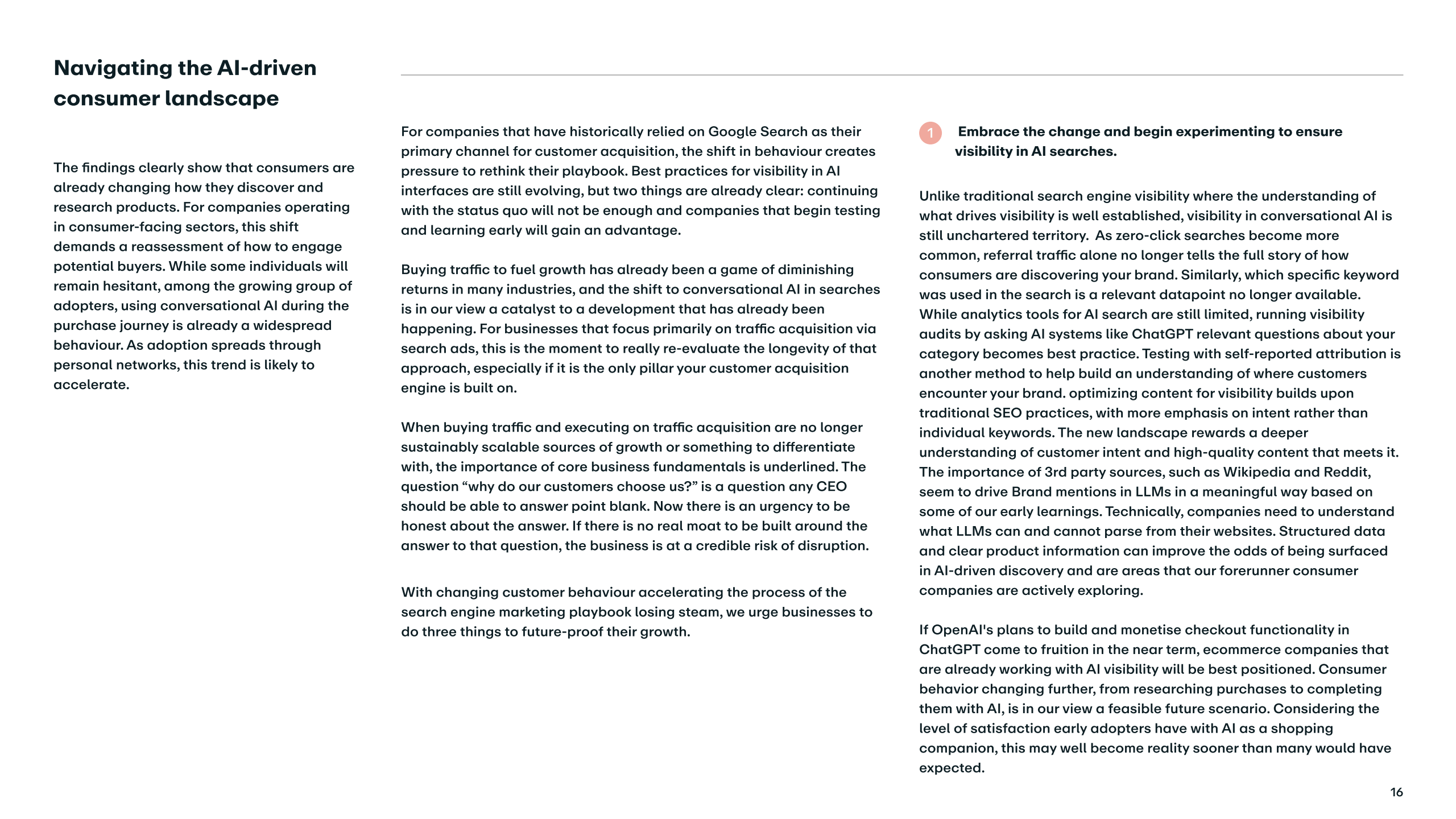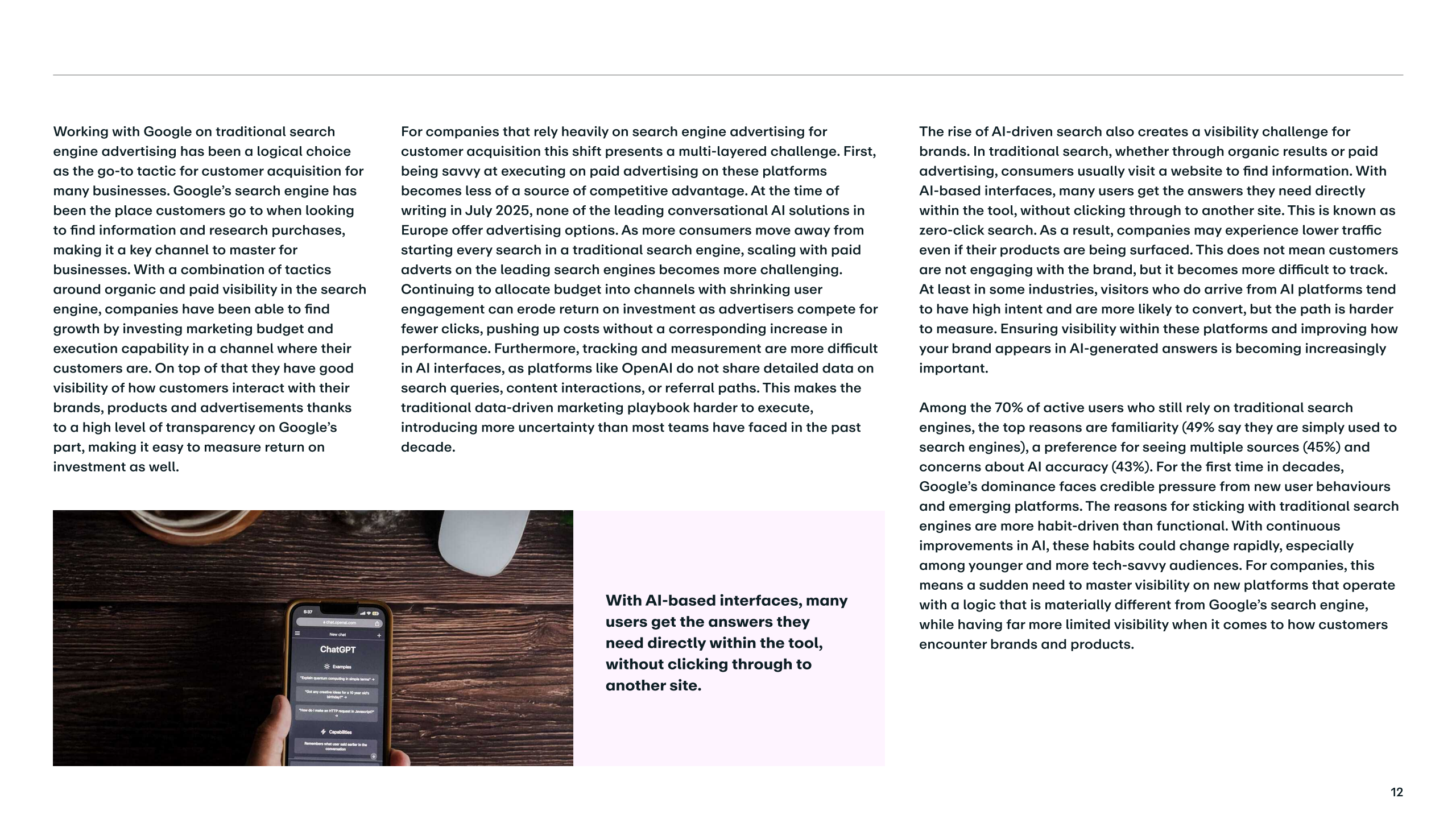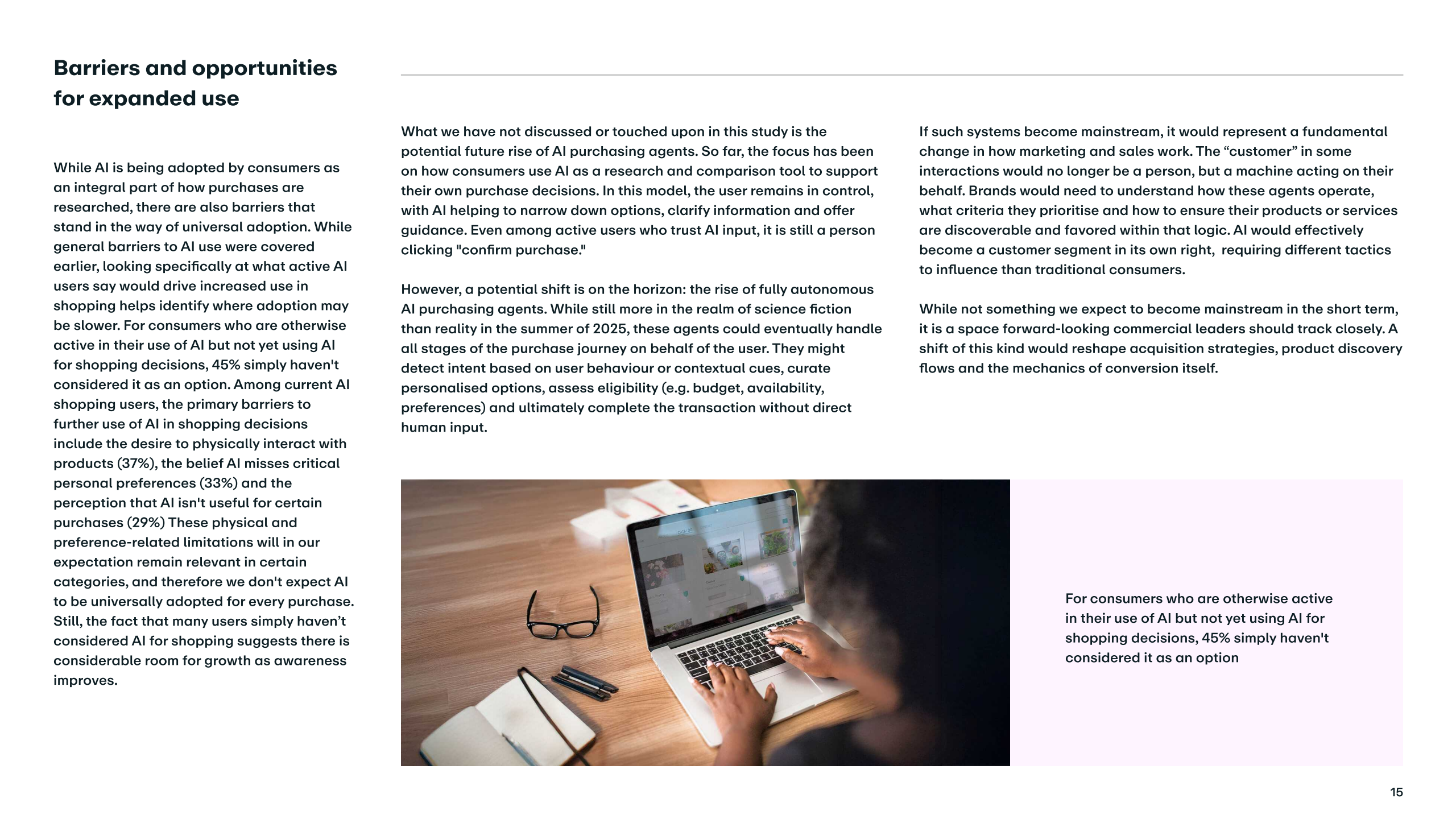 在信息获取方式上,消费者行为已出现实质性转向。30%的活跃用户已偏好使用对话式AI而非传统搜索引擎获取信息,其核心原因包括直接给出答案、信息总结能力更强以及支持自然语言追问。研究显示,76%的活跃用户已使用AI进行购物研究,其中17%在大多数或每一次购买决策中依赖AI。这意味着搜索引擎不再是消费者研究产品的唯一入口,零点击获取信息正在成为新常态。