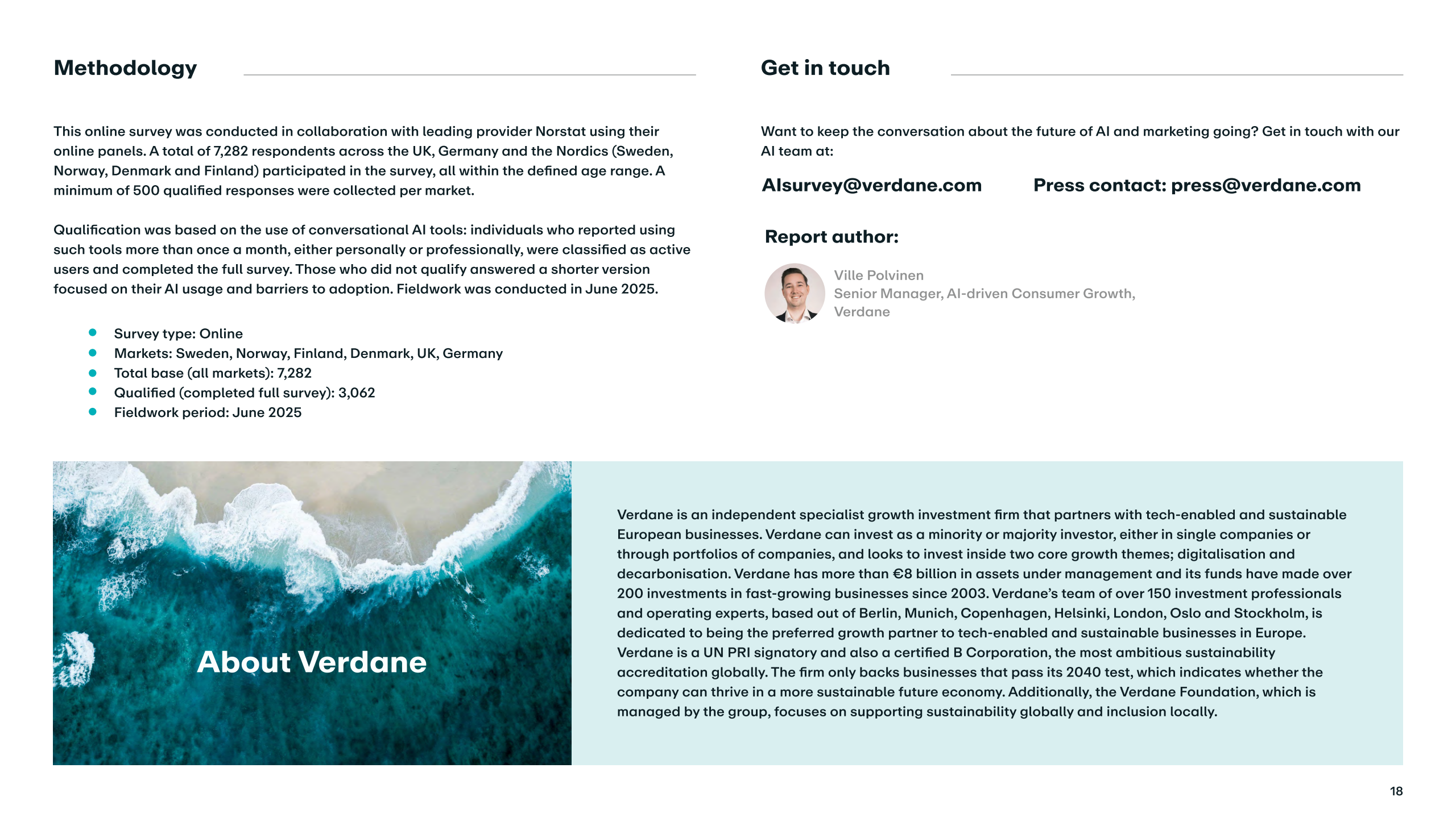 本报告基于Verdane与Norstat于2025年6月在英国、德国及北欧六国对7,282名18至60岁消费者的调查,系统揭示了对话式人工智能在欧洲消费者中的真实渗透水平与行为变化。整体来看,42%的受访者已成为活跃用户,即至少每月在工作或私人场景中使用一次对话式AI。其中,私人场景的采用率显著高于工作场景,平均私人活跃使用率为53%,而工作场景为41%。这一结构性差异表明,AI并非首先作为生产力工具普及,而是率先融入消费者的日常生活。