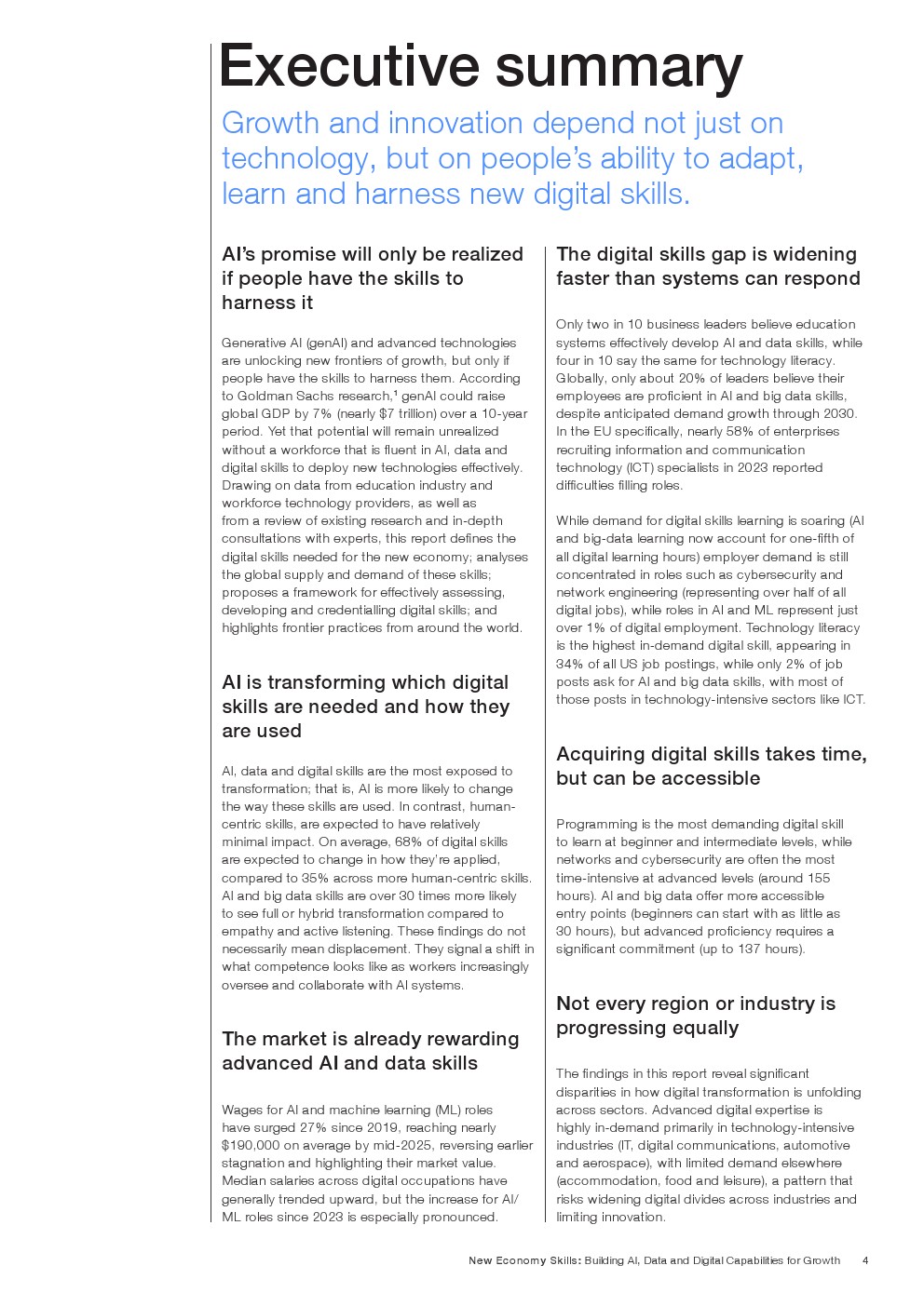 综合来看,全球劳动力市场正在经历从“技术驱动”向“人机协同”的结构性转型。未来竞争力不再只是技术能力的堆叠,而是人类能力与技术能力的结合。能够系统培养创造力、韧性与终身学习能力的组织和经济体,将在AI时代获得更持久的增长优势。