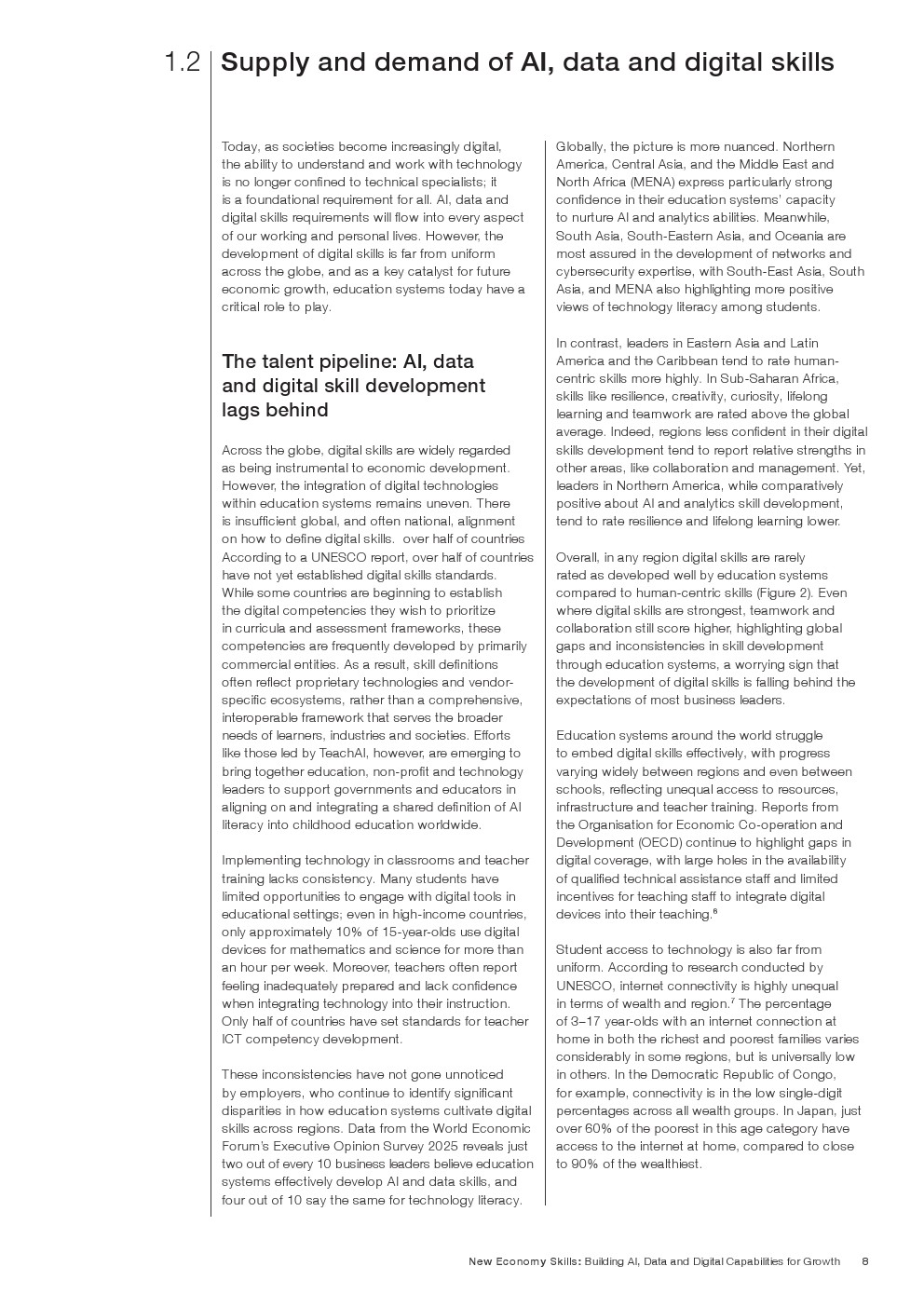 然而供需之间存在明显缺口。全球仅约一半雇主认为其员工在创造力或协作方面具备充分能力,而在好奇心和终身学习方面的能力评价更低。教育体系虽然普遍强调团队合作,但不到一半的企业认为学校能够有效培养创造力、好奇心或韧性,这显示人才培养体系仍未完全匹配未来经济需求。