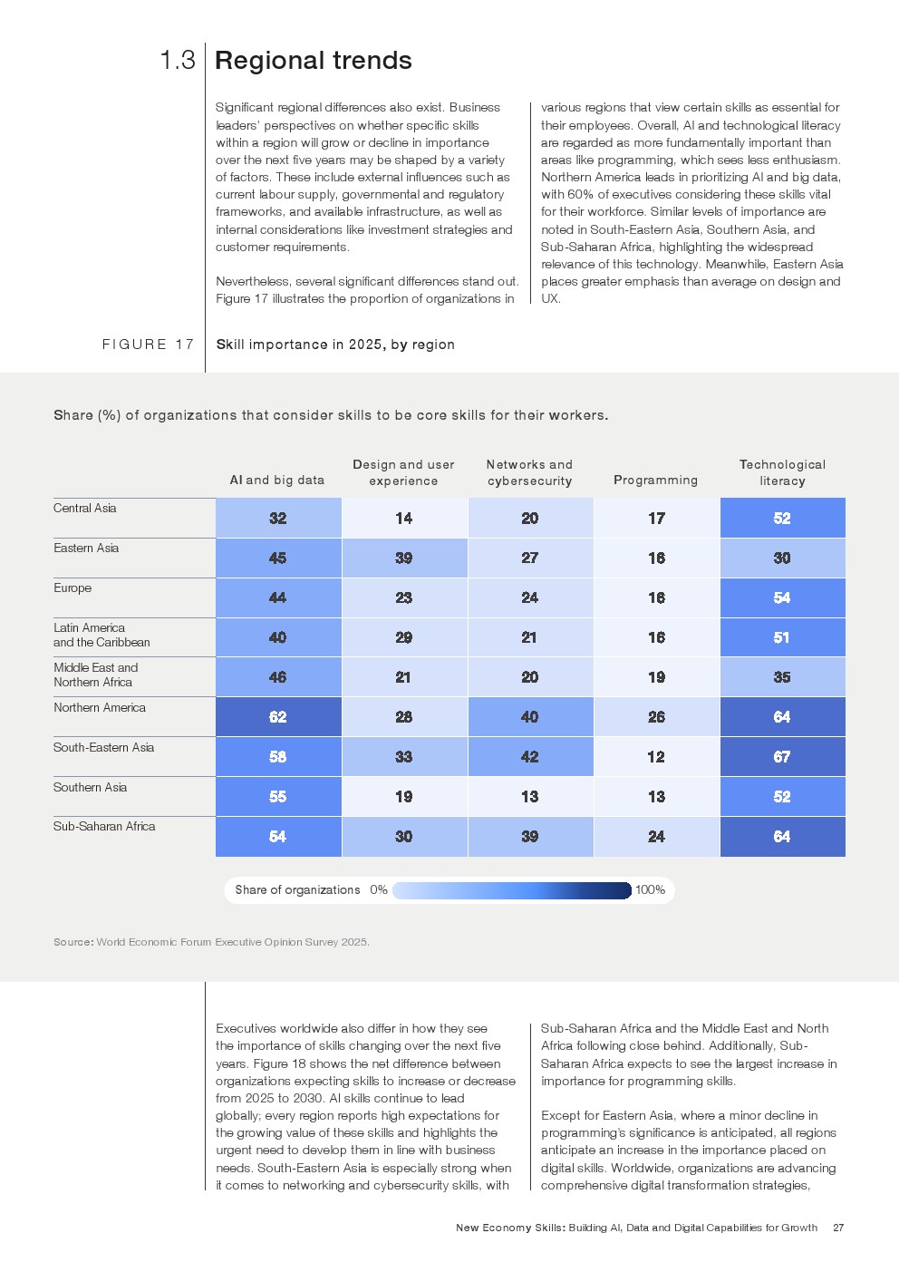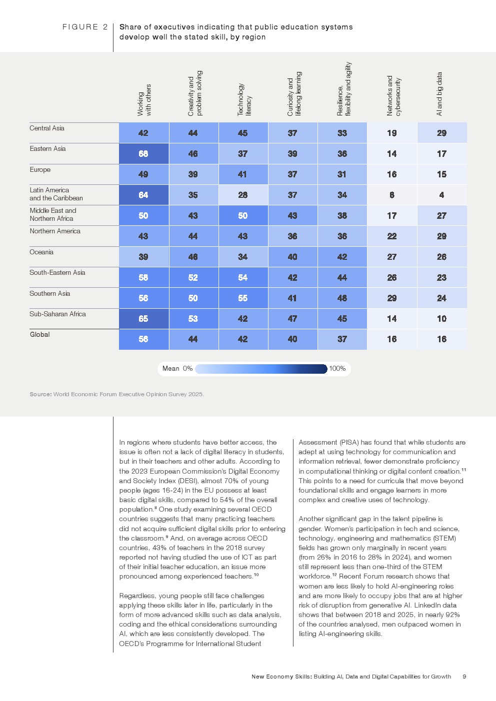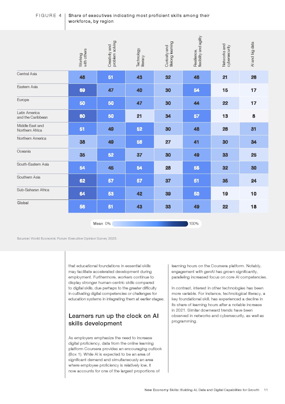 区域差异同样明显。东亚和加勒比地区对人类技能准备度最为乐观;北美和大洋洲在创造力与问题解决能力上表现较强,但在协作方面较弱;撒哈拉以南非洲在创造力、韧性和好奇心方面评分高于全球平均水平,显示不同地区的人才结构正在形成独特优势。