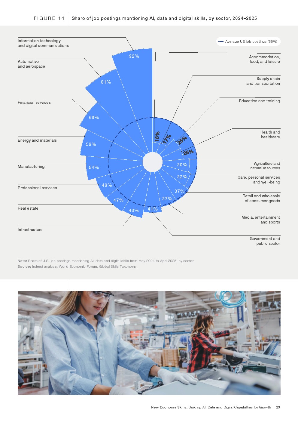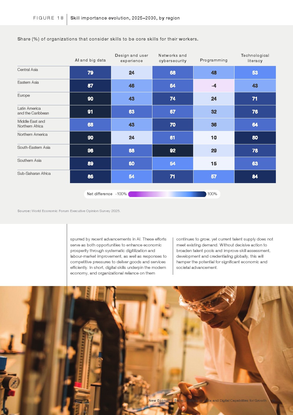 人工智能和自动化加速渗透,劳动力市场的核心竞争力正在从技术能力转向“以人为中心”的技能体系。世界经济论坛报告指出,未来五年约40%的核心工作技能将被重塑,同时预计新增岗位约1.7亿个、被替代岗位约9200万个,接近80%的企业将再培训和技能升级列为关键战略。