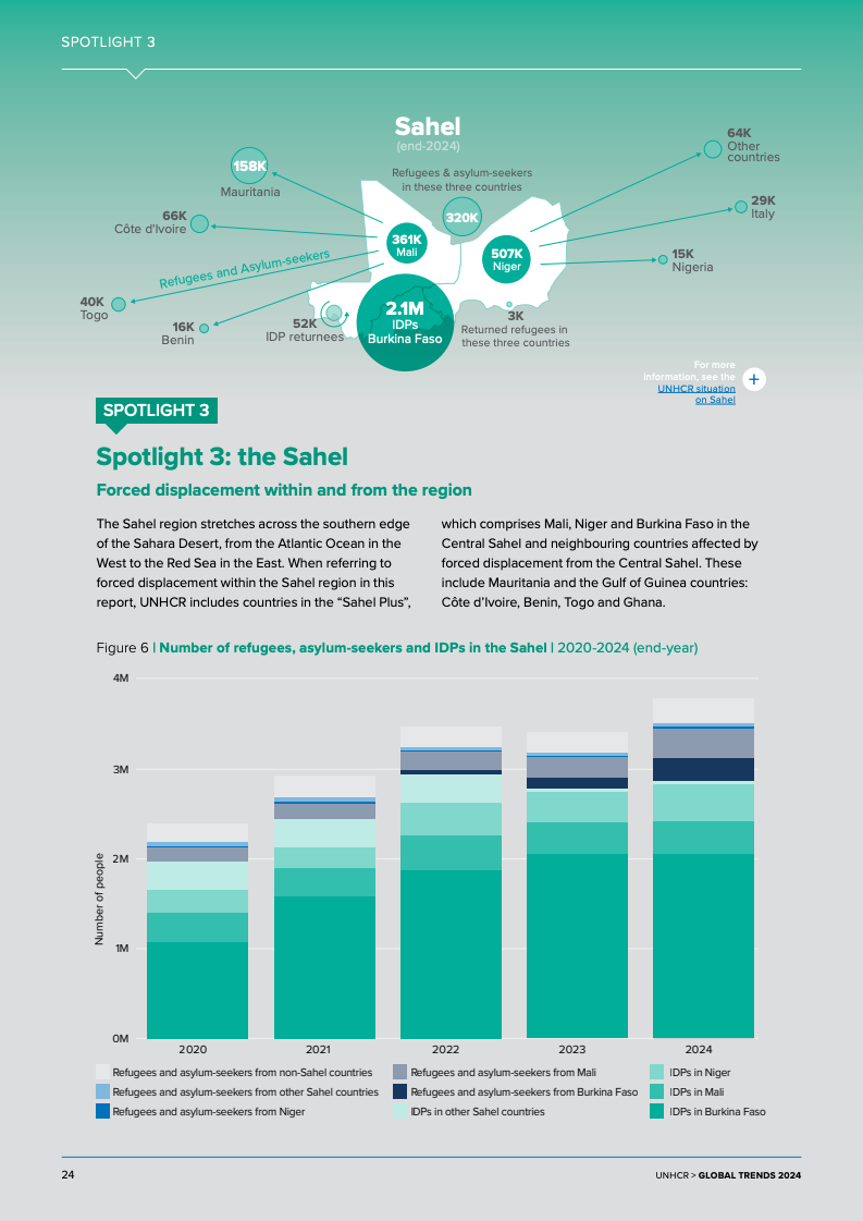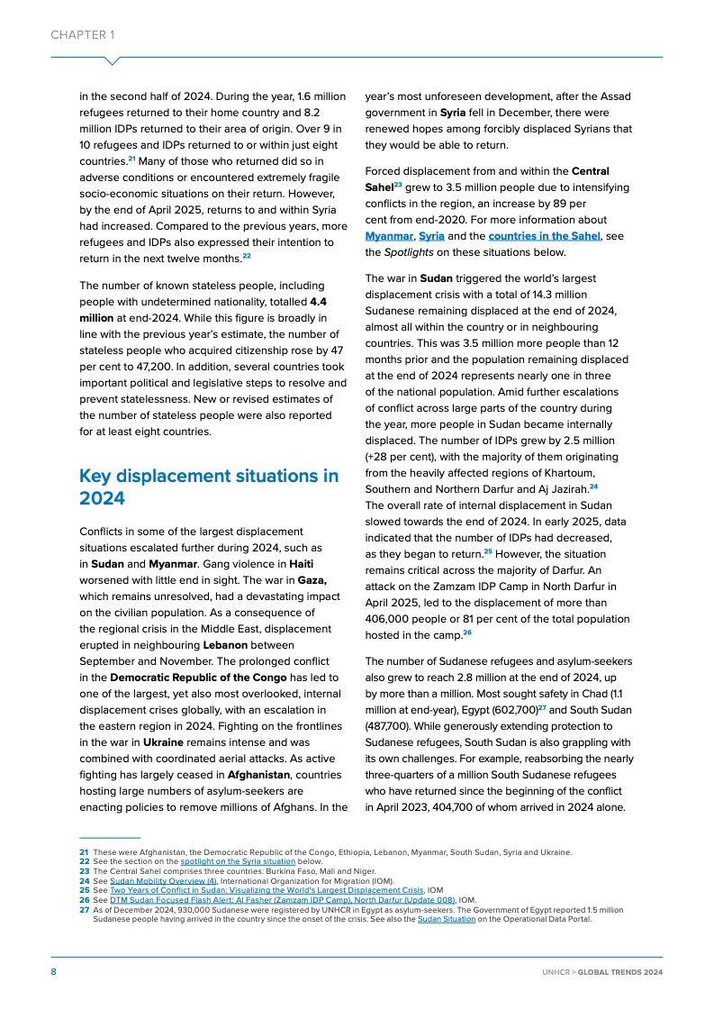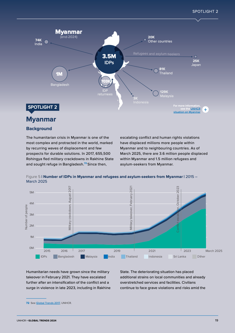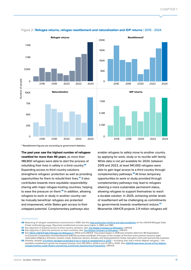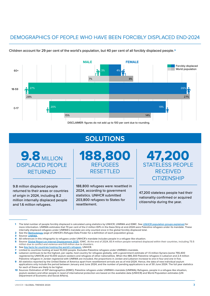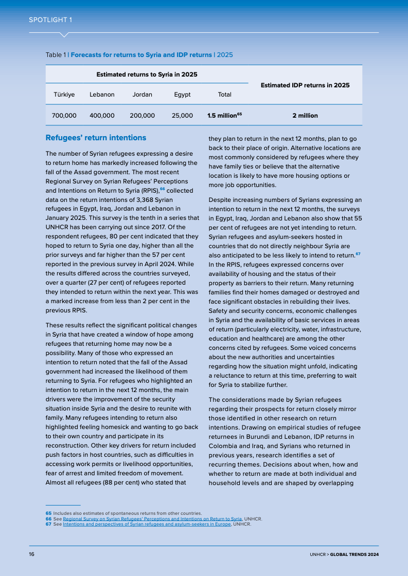 值得注意的是,2024年难民返乡人数达160万,为近20年来最高。返乡主要集中于叙利亚、南苏丹、阿富汗和乌克兰,虽然返乡意愿增强,却面临安全、经济复建及社会服务的诸多挑战,多数返乡地区仍处于不稳定状态。境内流离失所者的返乡数目也大幅攀升,达到820万人,同比增长61%,这表明局部和平进展及相关援助虽见成效,但可持续稳定仍需国际支持和地区政治解决。