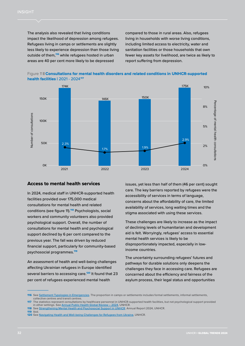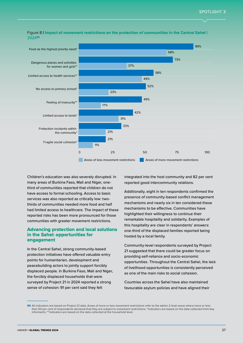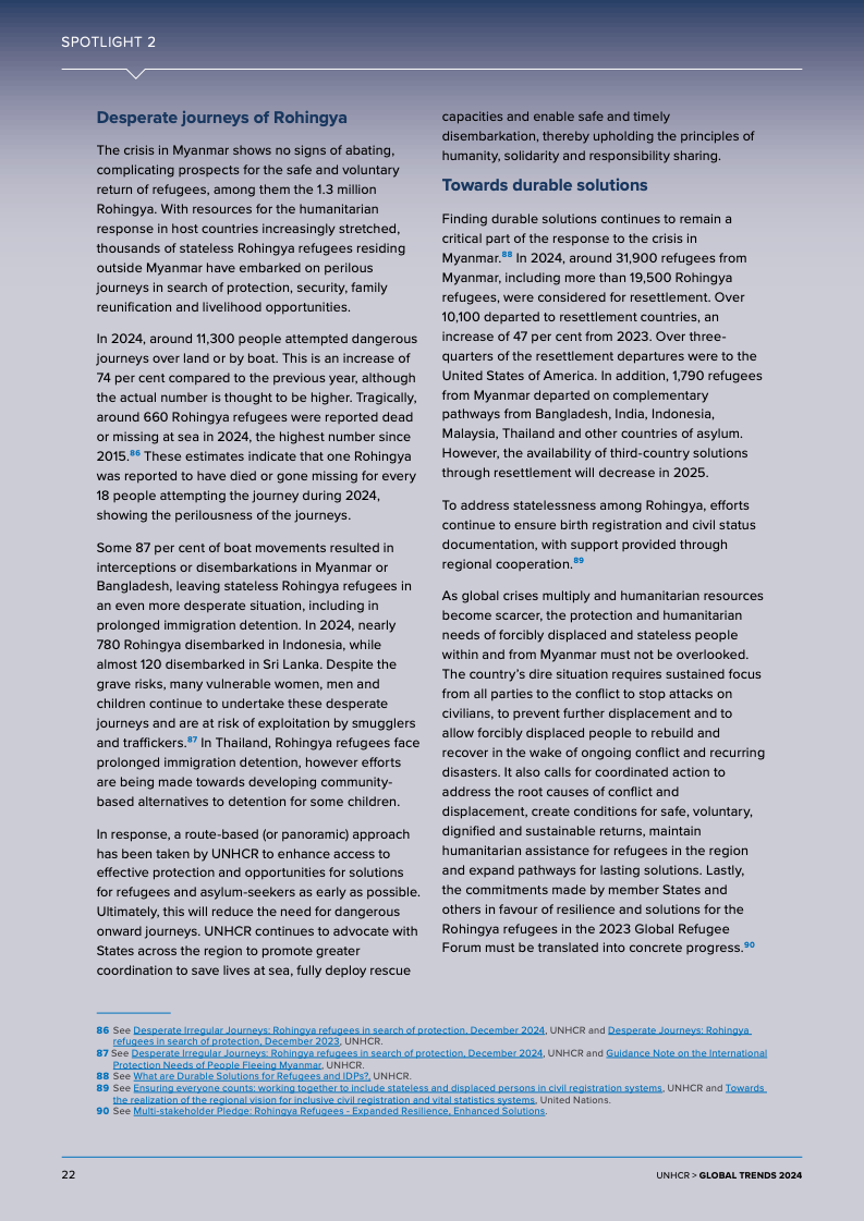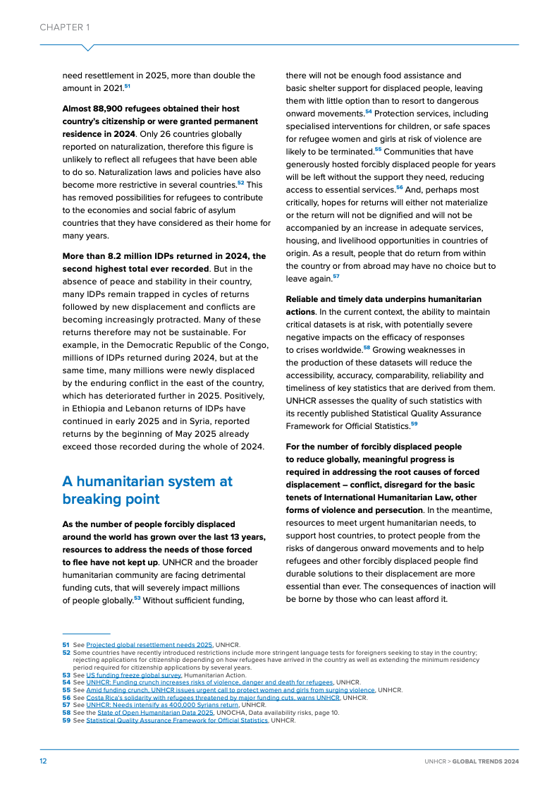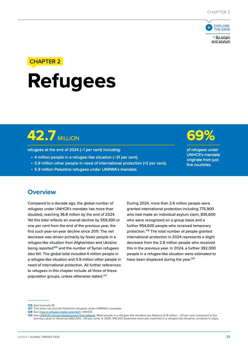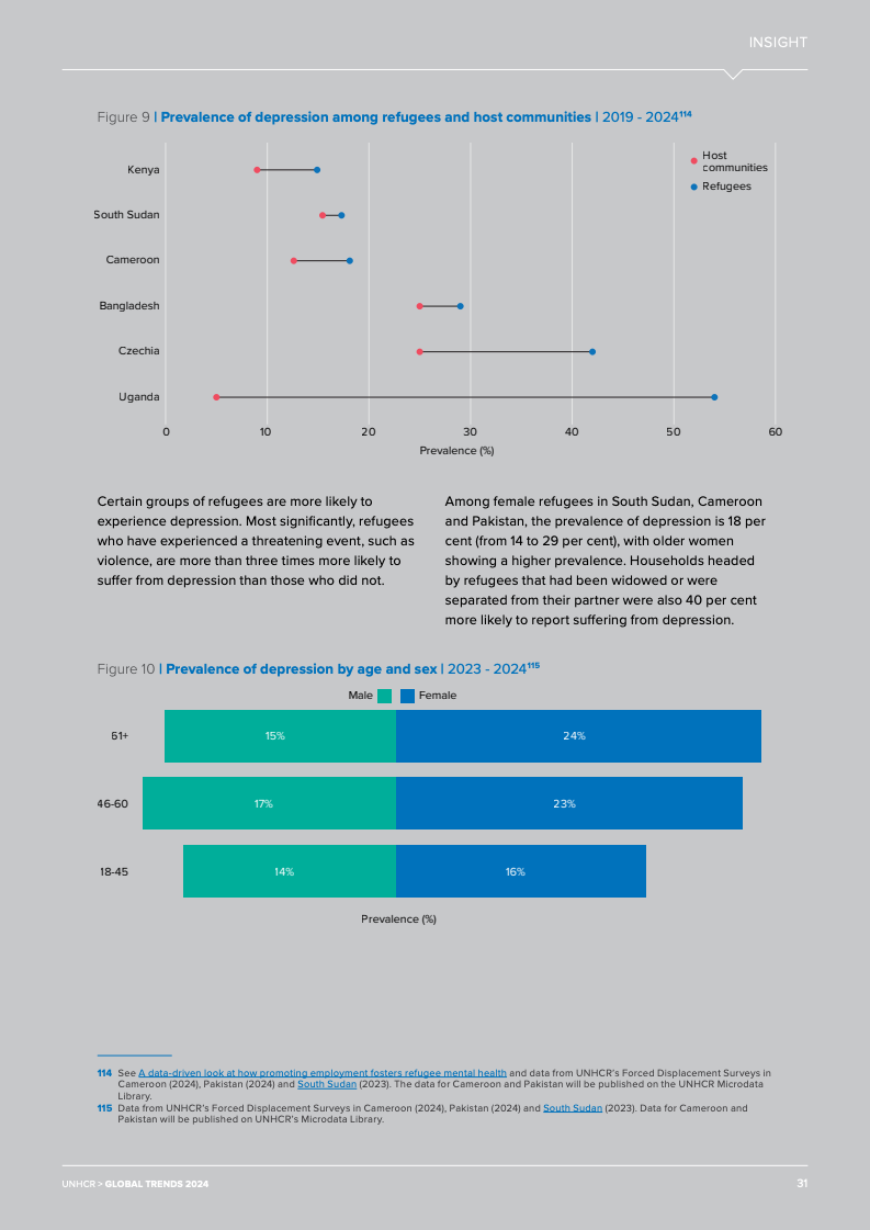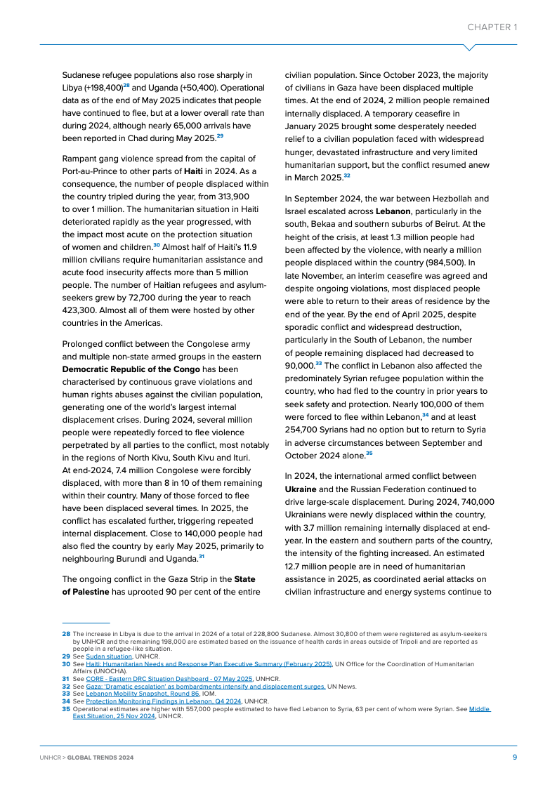 值得注意的是,2024年难民返乡人数达160万,为近20年来最高。返乡主要集中于叙利亚、南苏丹、阿富汗和乌克兰,虽然返乡意愿增强,却面临安全、经济复建及社会服务的诸多挑战,多数返乡地区仍处于不稳定状态。境内流离失所者的返乡数目也大幅攀升,达到820万人,同比增长61%,这表明局部和平进展及相关援助虽见成效,但可持续稳定仍需国际支持和地区政治解决。