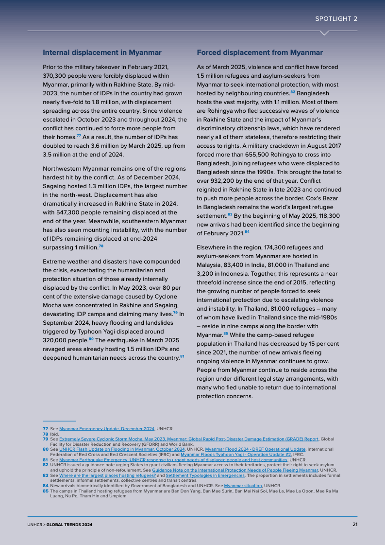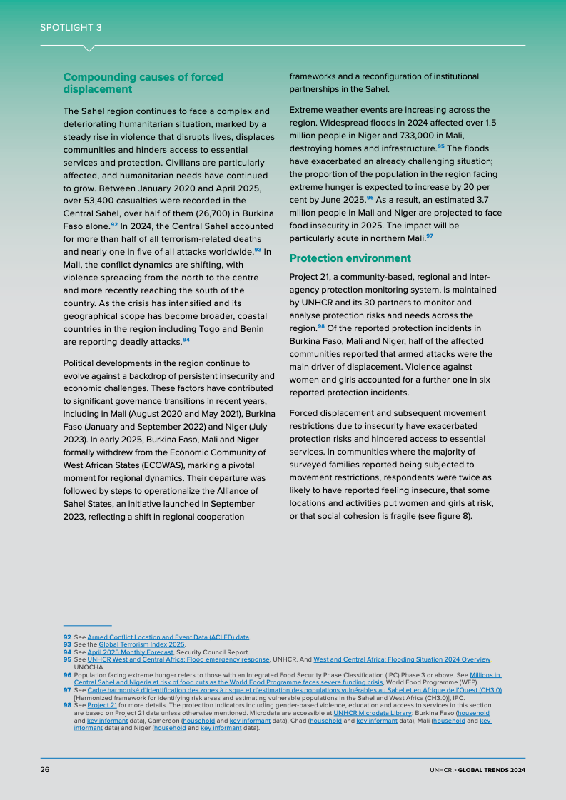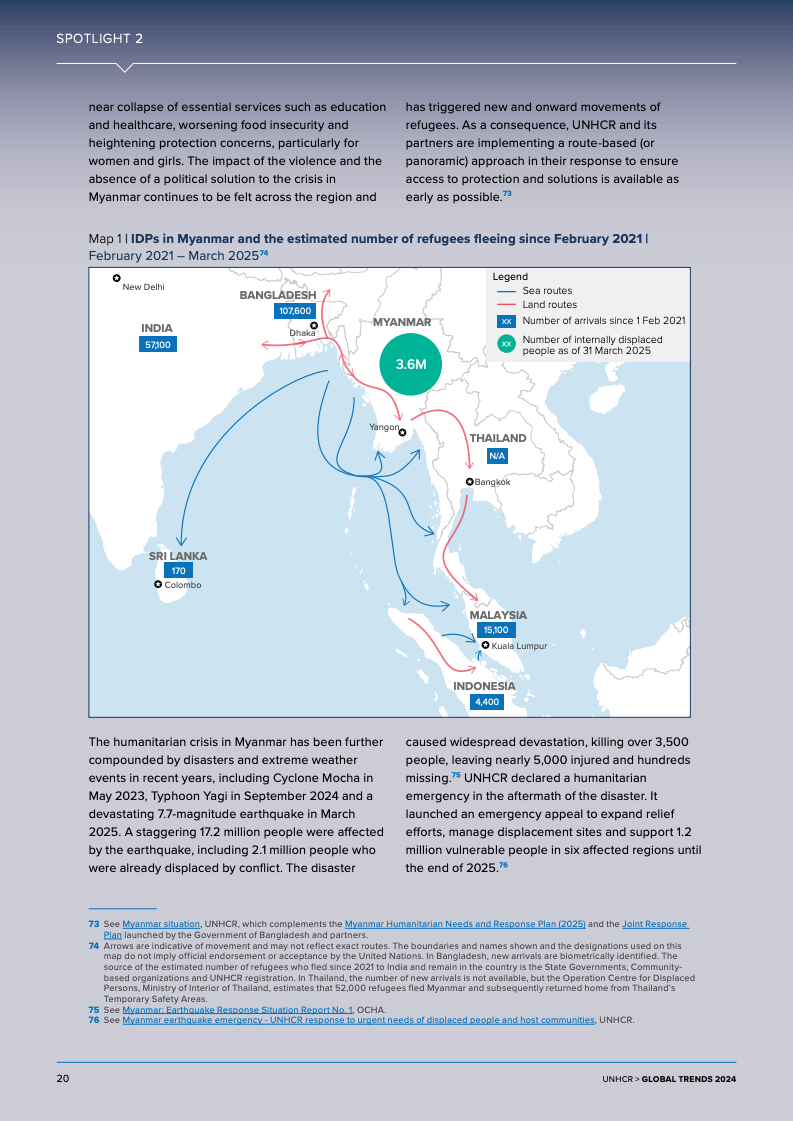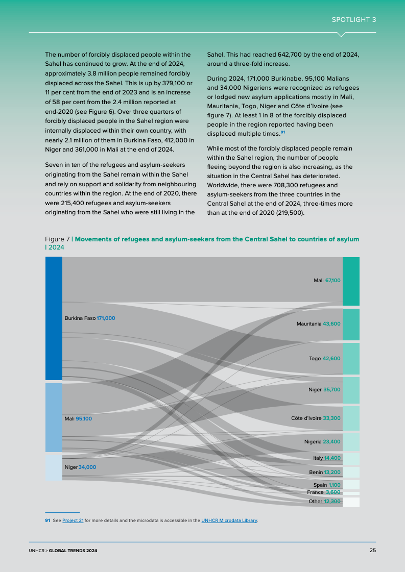 内部流离失所者继续构成强制流离群体的大头,数量达73.5百万,占比60%,其中受苏丹冲突影响最大,境内流离失所人数突破1100万,创历史新高。新流离失所人口达到2010年以来的最高峰,数据显示2024年发生的新境内流离失所人数为2010年以来首次达到两千万级别。此外,气候和自然灾害引发的流离失所达到史上最高,造成4580万人次新增境内迁徙,这表明环境风险与政治冲突双重作用使局势更为复杂。