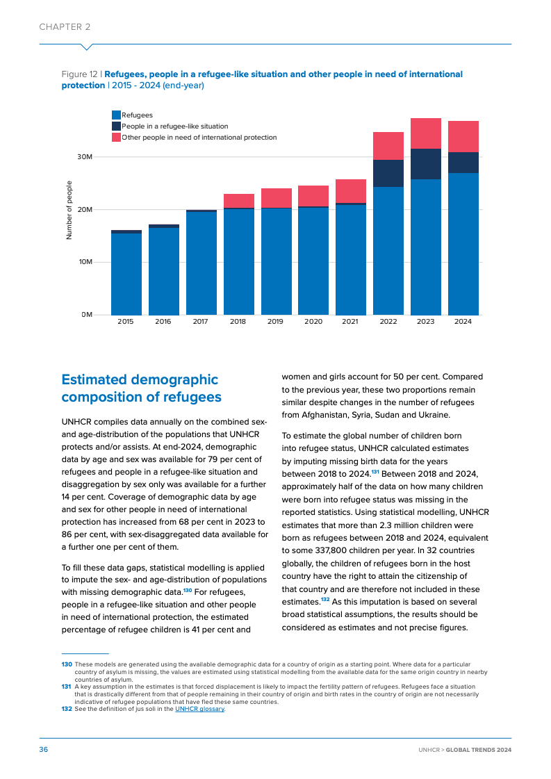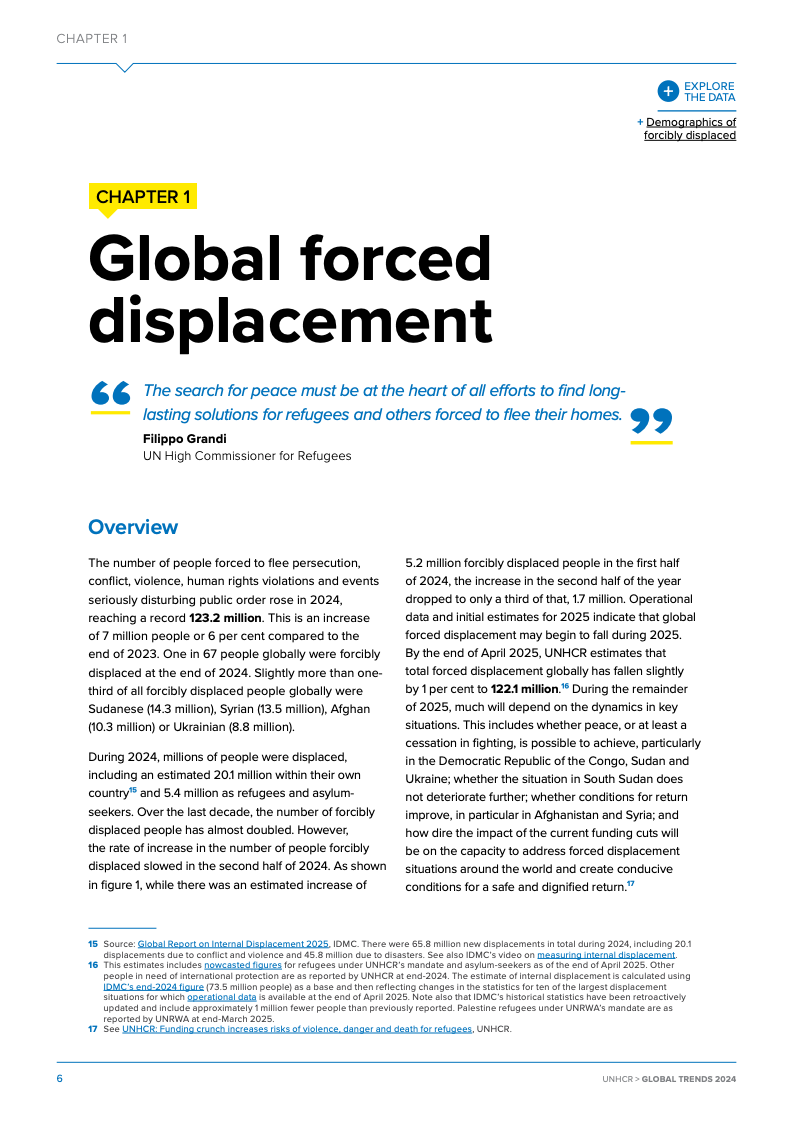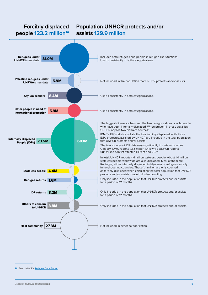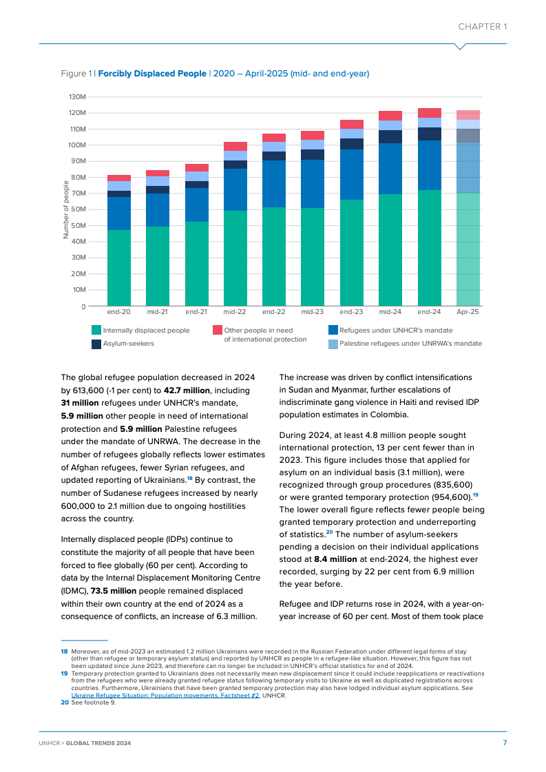 随着2024年收官,联合国难民署发布的《2024年全球强制流离失所趋势报告》显示,全球被迫离开家园的人数达到了前所未有的123.2百万,较2023年增加了700万人,增幅为6%。此数据涵盖了难民、寻求庇护者、境内流离失所者以及需要国际保护的其他群体,反映了全球政治冲突、暴力、人权侵犯及公共秩序严重扰乱的加剧态势。