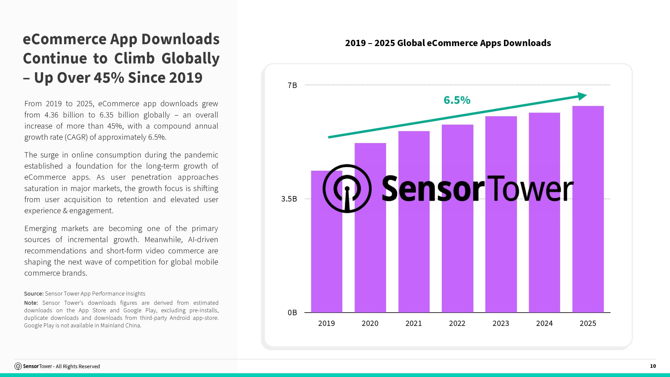 从2019年到2025年,全球电商应用年下载量从43.6亿次增长至63.5亿次,增幅超过45%,年复合增长率(CAGR)约为6.5%。