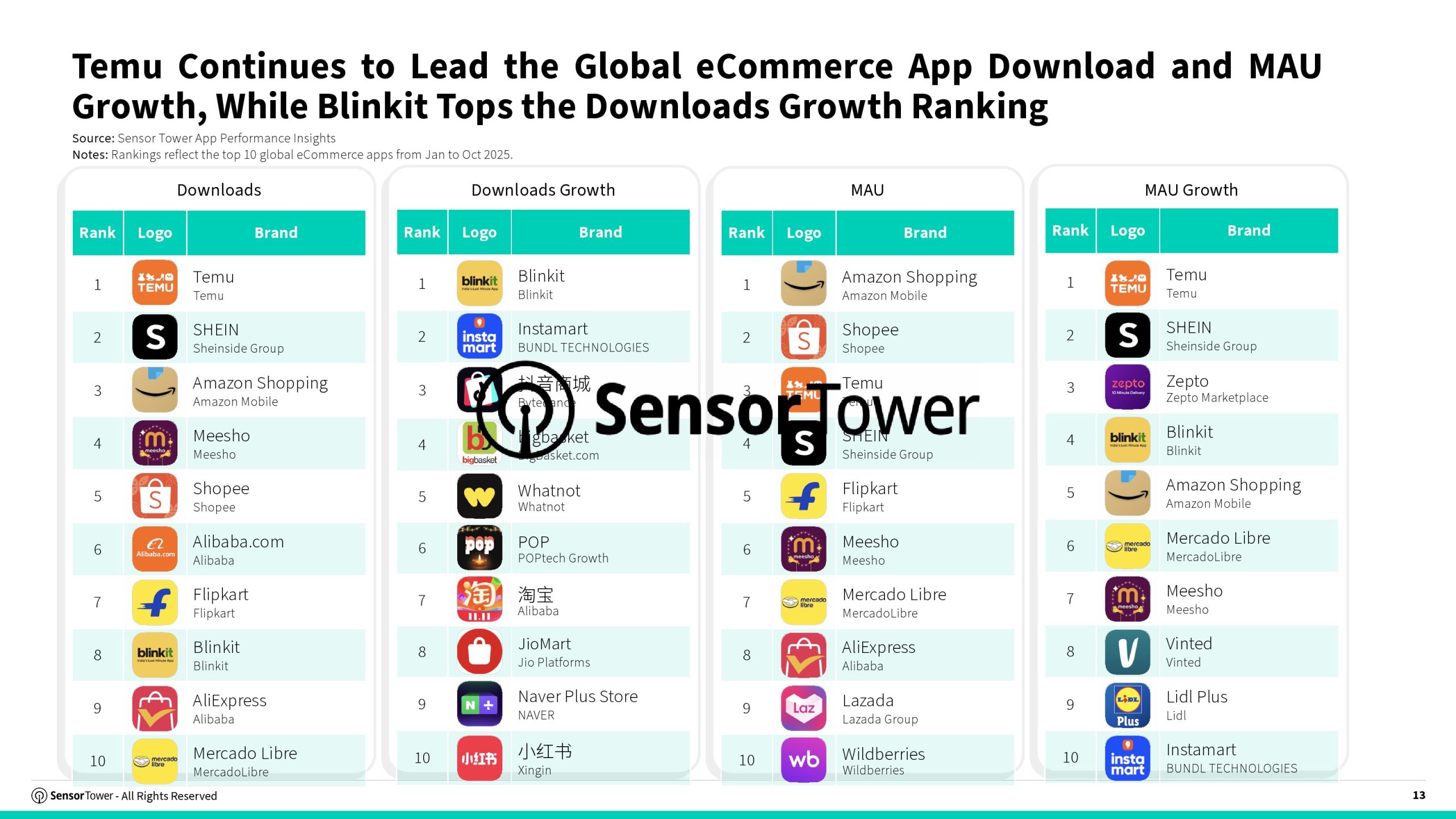 Temu在下载量和MAU增长排名中保持全球领先,Blinkit登顶下载增长榜