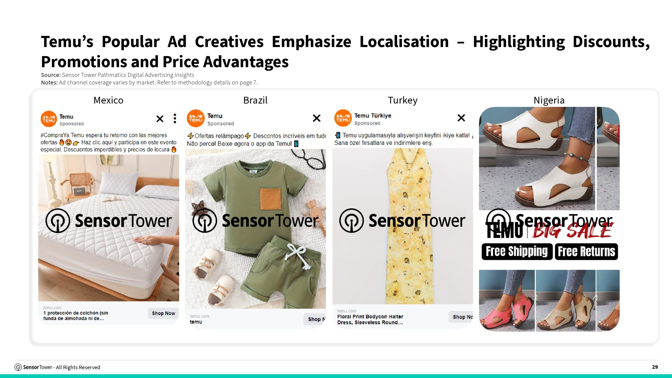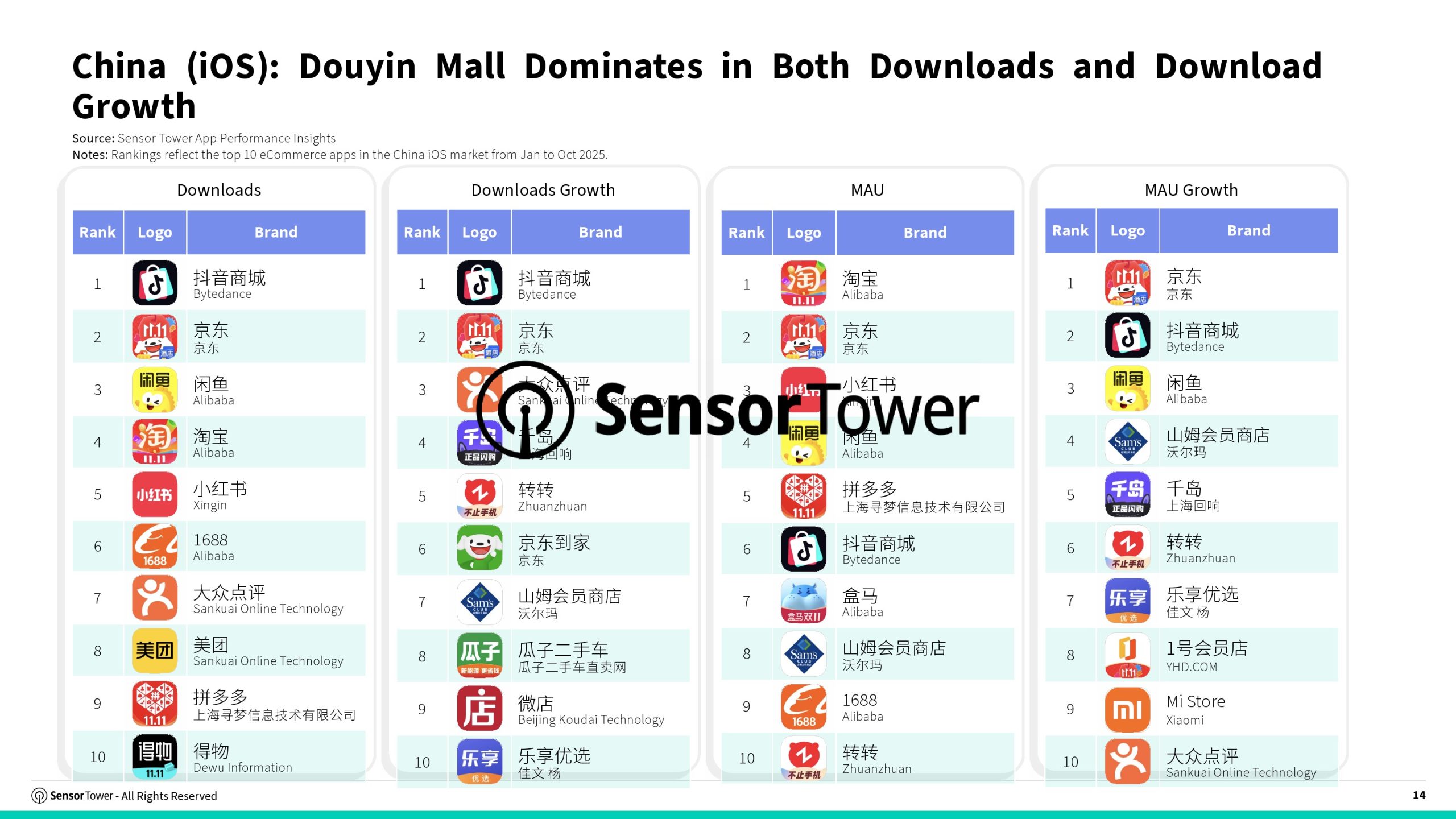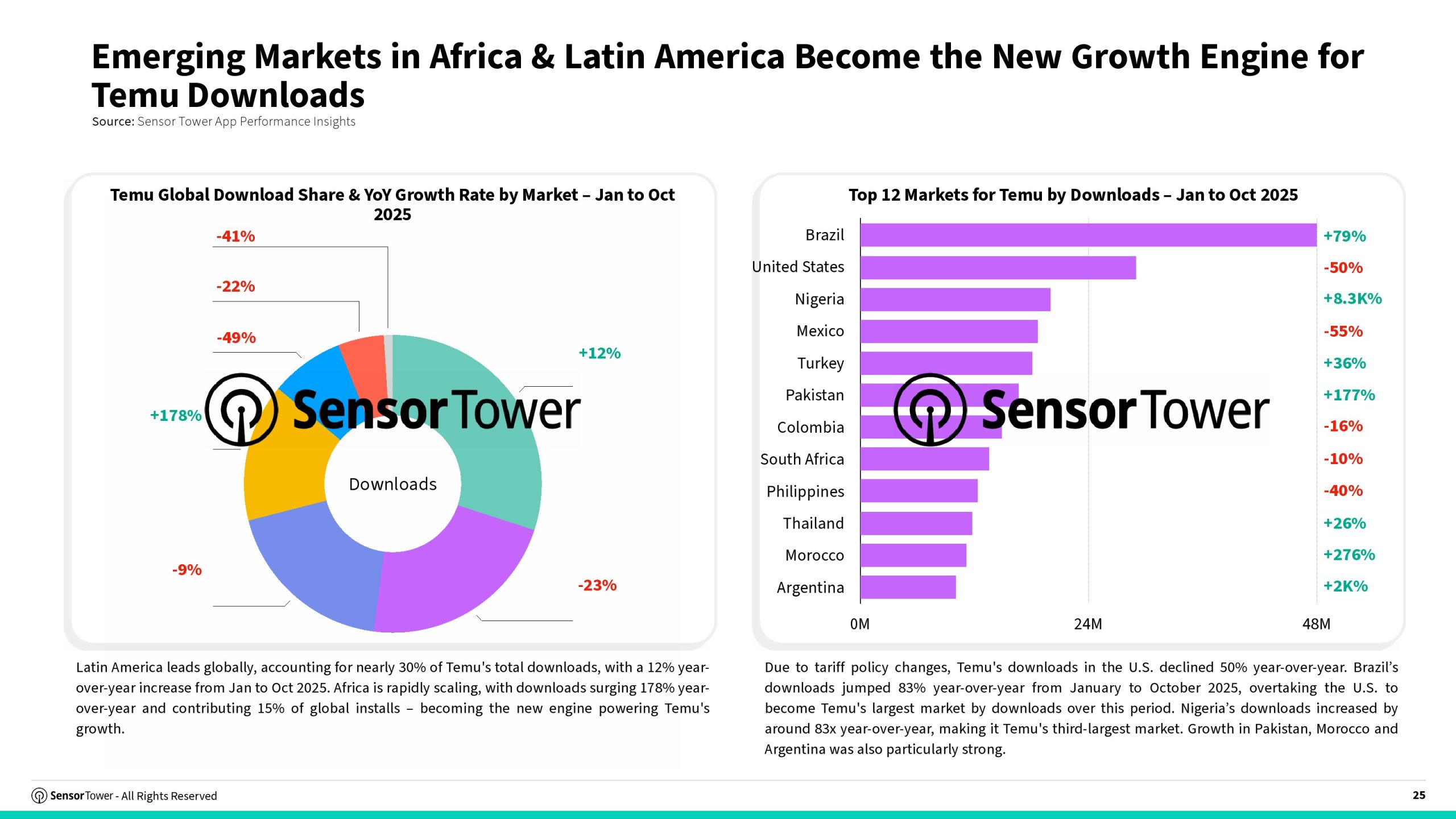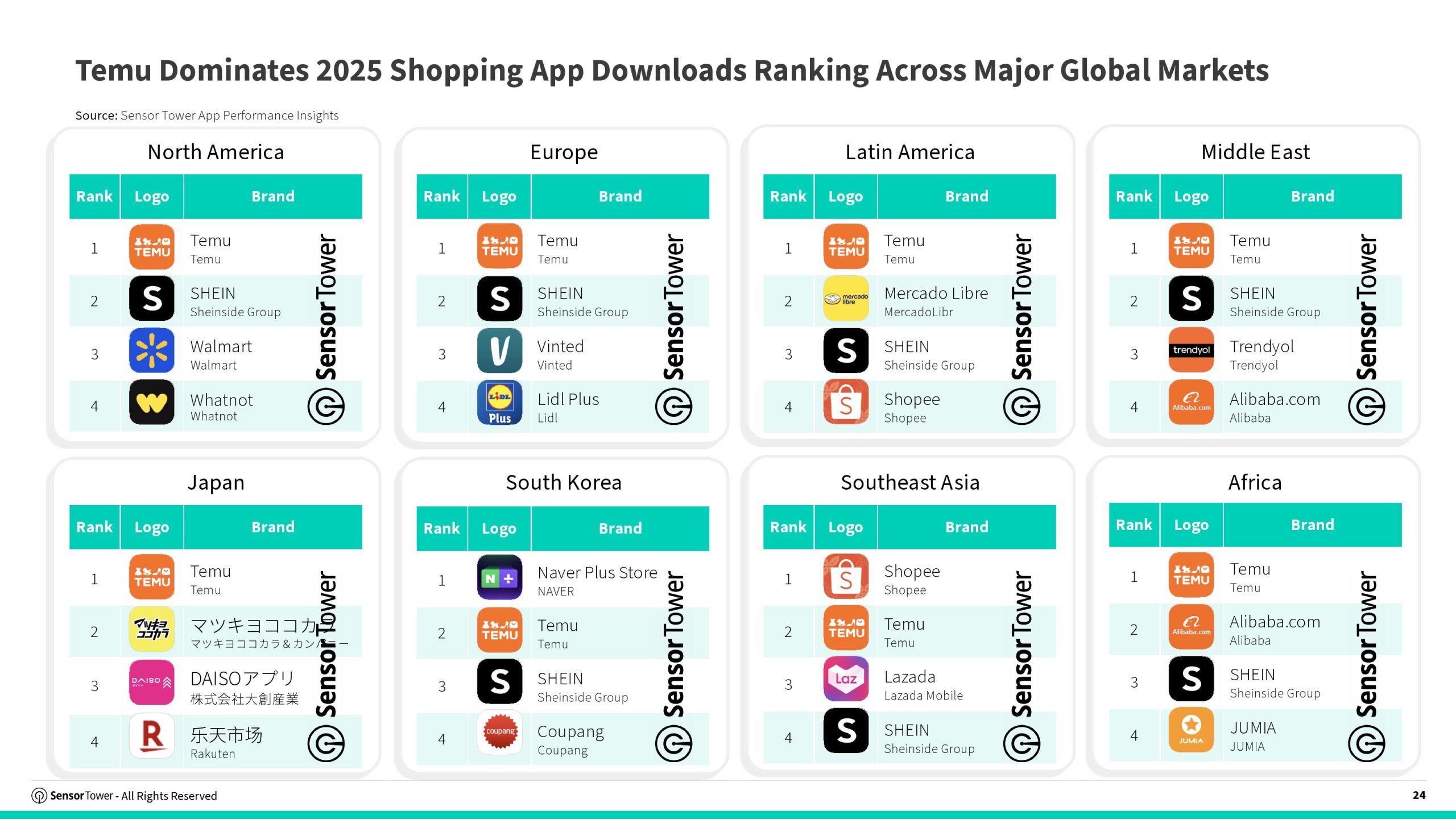 Temu继续主导全球电商格局,再次在全球下载量和月活跃用户(MAU)增长方面位居第一。其在多个地区(尤其是拉丁美洲、非洲和中东)的强劲势头推动了持续扩张,促进了用户获取和参与度。这巩固了Temu作为全球领先跨境电商平台的地位。