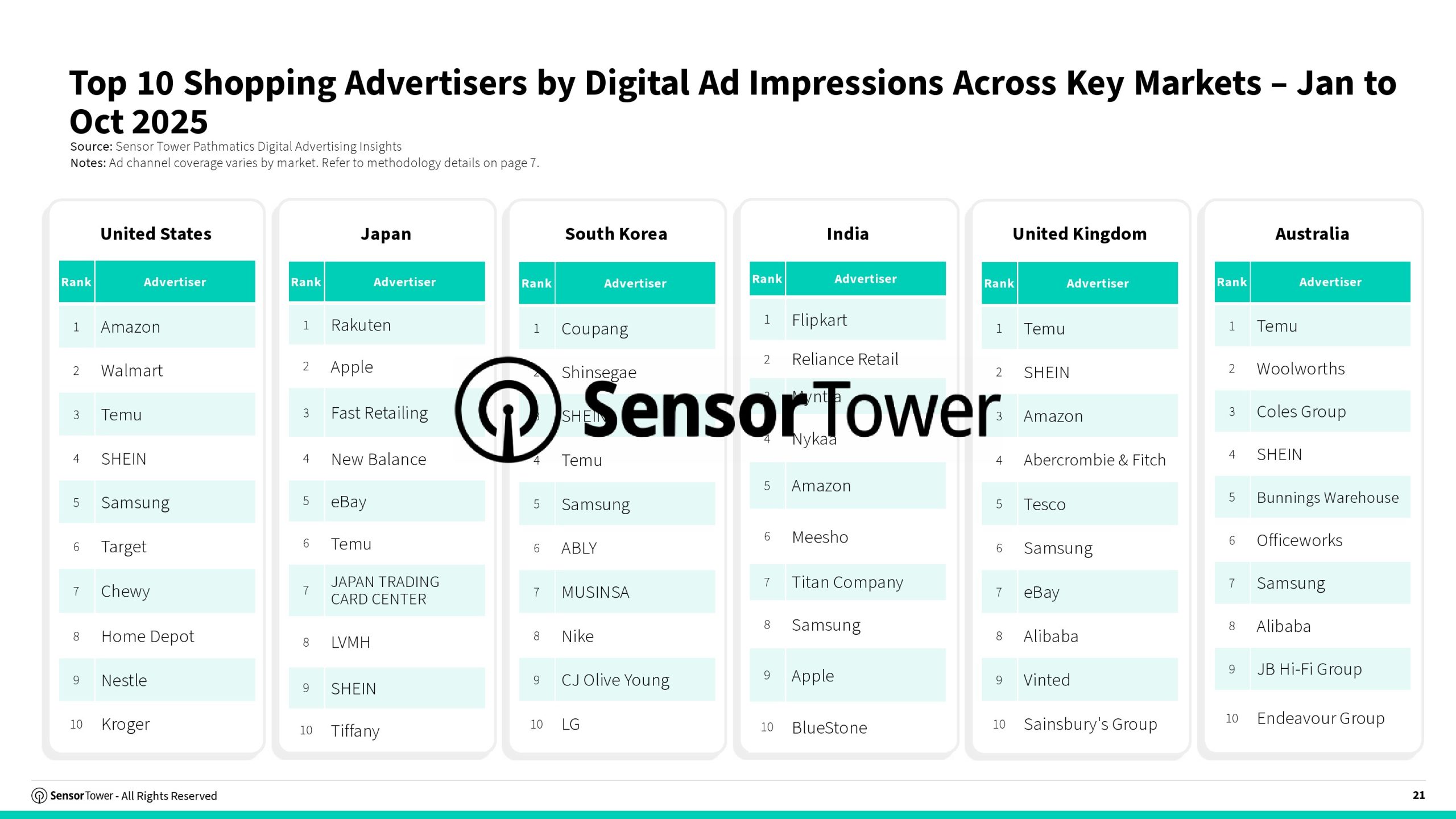 社交媒体平台仍然是全球购物品牌的主导广告渠道。Facebook和Instagram合计占主要市场总广告展示量的70%以上。然而在日本,LINE主导着数字广告格局,在2025年1月至10月期间贡献了近50%的总广告展示量。