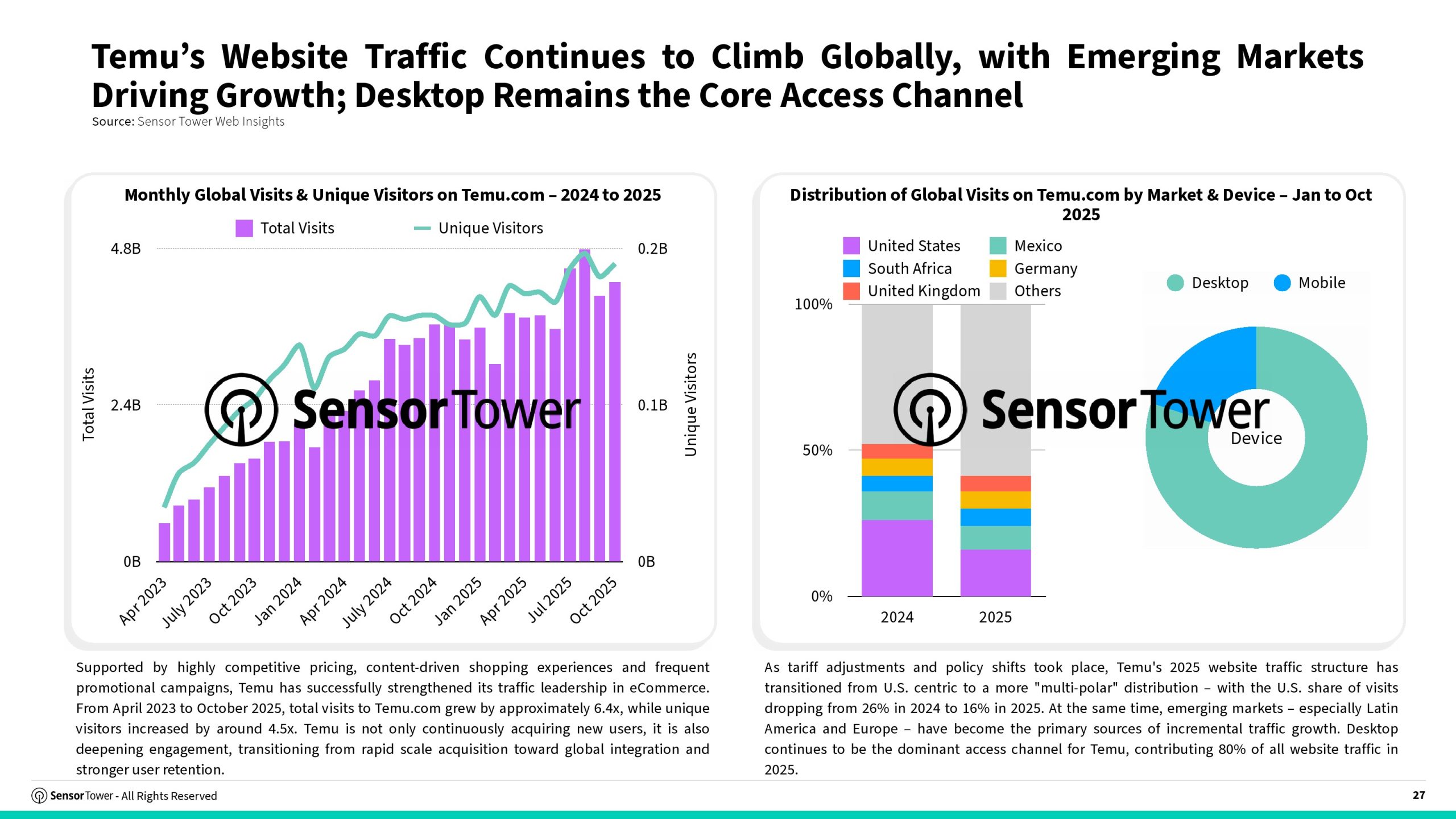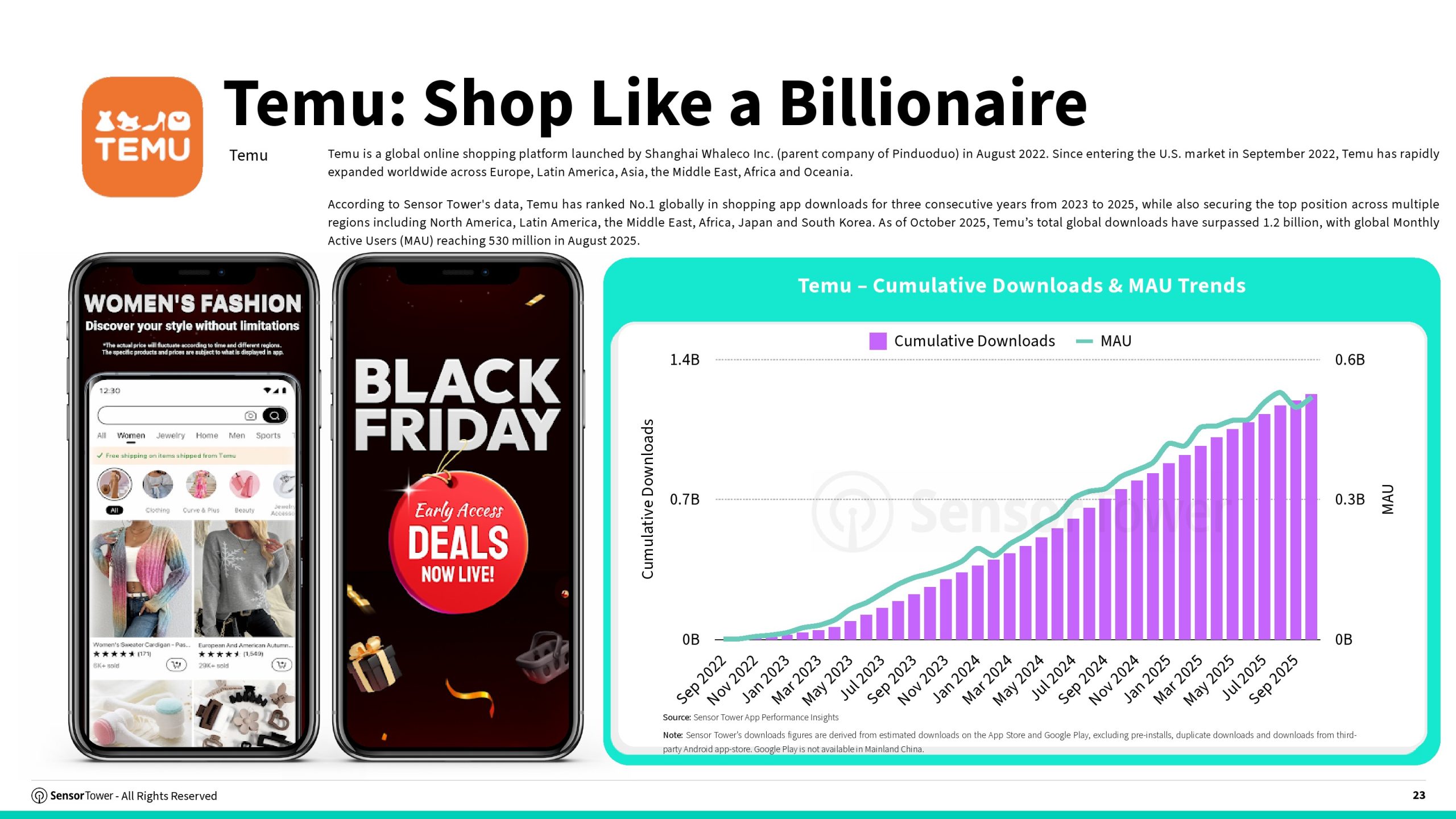 Sensor Tower数据显示,从2023年到2025年,Temu连续三年成为全球下载量最高的购物应用,同时在北美、拉丁美洲、中东、非洲、日本和韩国的品类排名中也位列第一。截至2025年10月,Temu全球累计下载量已超过12亿次,并在2025年8月达到了5.3亿月活跃用户(MAU)的历史新高。