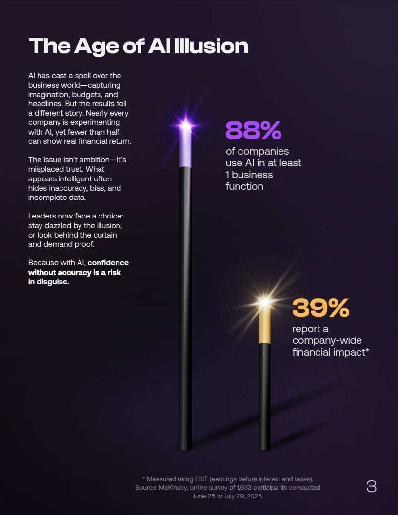 当前企业界正全面拥抱人工智能,但数据却揭示出一组高度反差的现实。根据麦肯锡2025年调研,88%的企业已在至少一个业务职能中使用AI,但仅有39%的企业确认AI对公司整体财务表现产生了正向影响,衡量标准为EBIT。技术渗透率与财务回报之间出现显著断层,核心原因并非应用意愿不足,而是企业对AI输出结果的准确性产生了系统性误判,形成“看似智能、实则失真”的使用幻觉。