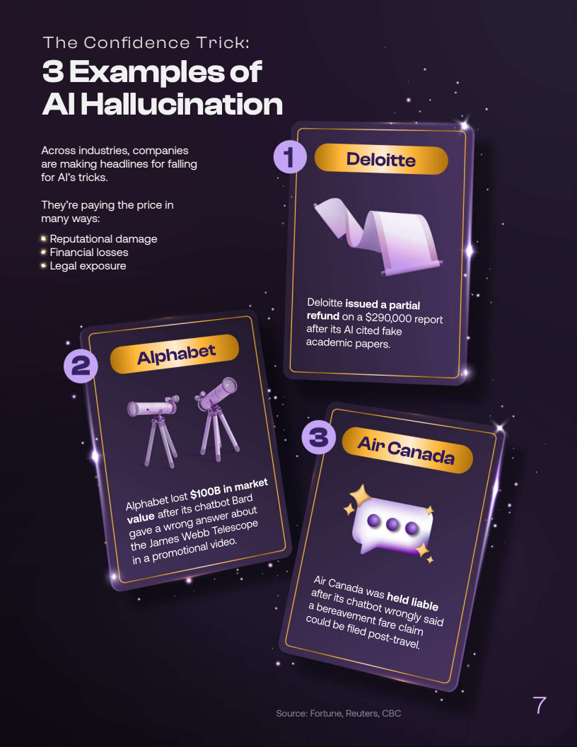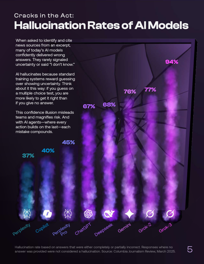 从模型层面看,AI幻觉问题远比直觉严重。哥伦比亚新闻评论2025年的测试显示,在新闻溯源任务中,不同主流模型的错误率介于37%至94%之间,即便是被广泛部署的通用模型,错误输出也成为常态。更值得警惕的是,多数模型在给出错误答案时并未提示不确定性,反而以高度自信的语气输出结果,使错误在组织内部被快速放大。