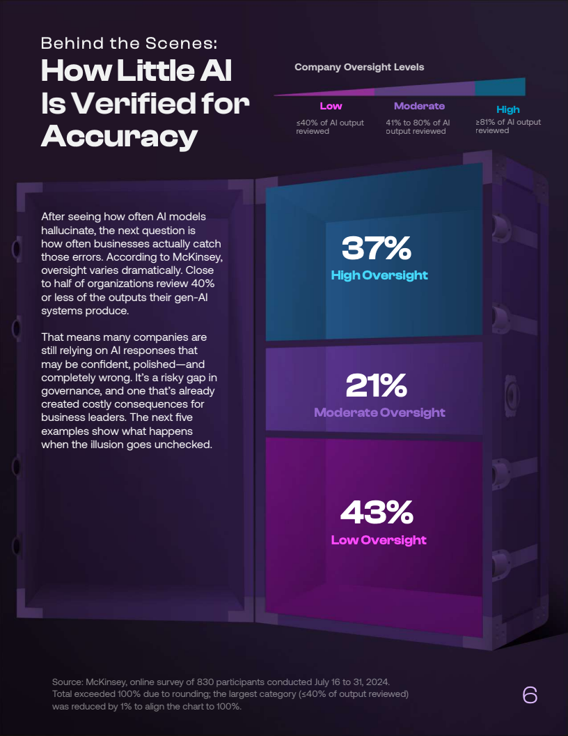 治理层面的数据同样不容乐观。麦肯锡2024年数据显示,43%的企业仅审核不超过40%的AI输出内容,仅37%的企业对81%以上的AI结果进行高强度审查。低验证率意味着大量决策建立在未经校验的内容之上,在自动化代理和连续决策场景中,单一错误会被指数级放大,直接推高合规、财务与声誉风险。