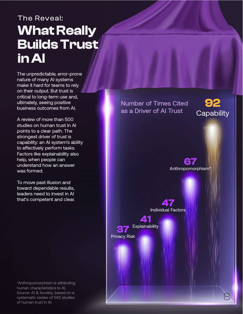关于“信任”的来源,系统性研究给出了清晰答案。对562项人机信任研究的综述表明,最核心的信任驱动因素是AI的实际能力,其被引用次数高达92次,显著高于拟人化特征的67次和可解释性的41次。这意味着,企业真正需要的不是更会“表达”的AI,而是基于高质量数据、可被追溯和验证的能力体系。