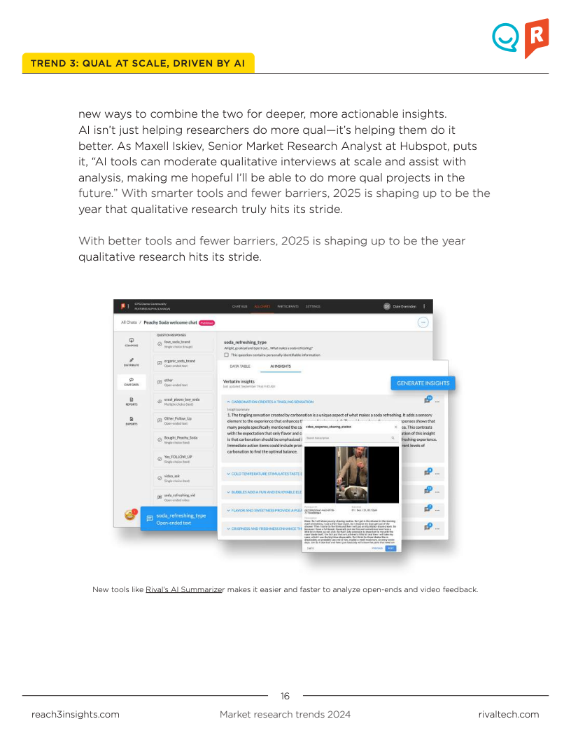 定性研究在AI助力下实现规模化:78%的受访者对AI自动转录与文本分析功能抱有期待,66%对视频反馈与虚拟现实等沉浸式体验感兴趣。混合研究模式——定量框架下的深度定性探究——正成为新标配。尽管定量仍占主导地位(70%市场份额),定性增速达14%,并有望在2025年迎来更大突破。
