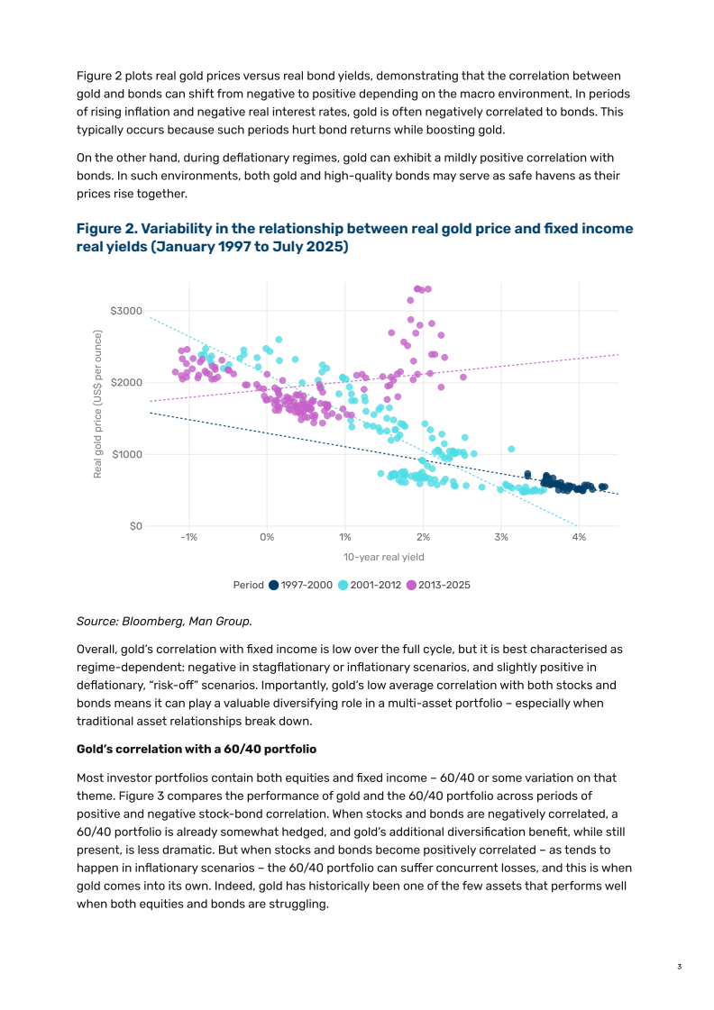 从资产相关性看,黄金年化波动率与标普500相近,但与股票的长期相关性接近于零,且在股市大幅回撤阶段并未出现持续性相关性上升。相较之下,黄金与债券的关系更具情景依赖性,在高通胀或实际利率为负时,黄金往往与债券呈负相关,而在通缩或极端避险环境中则可能同步上涨。