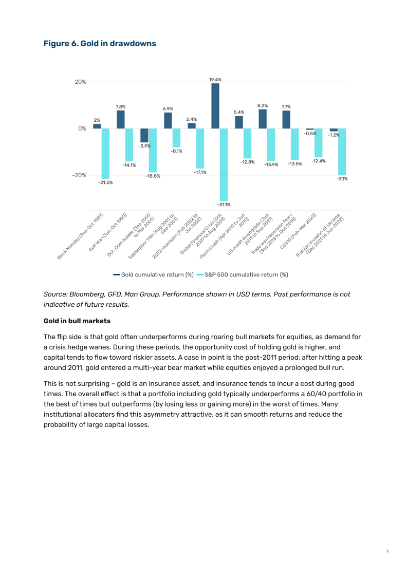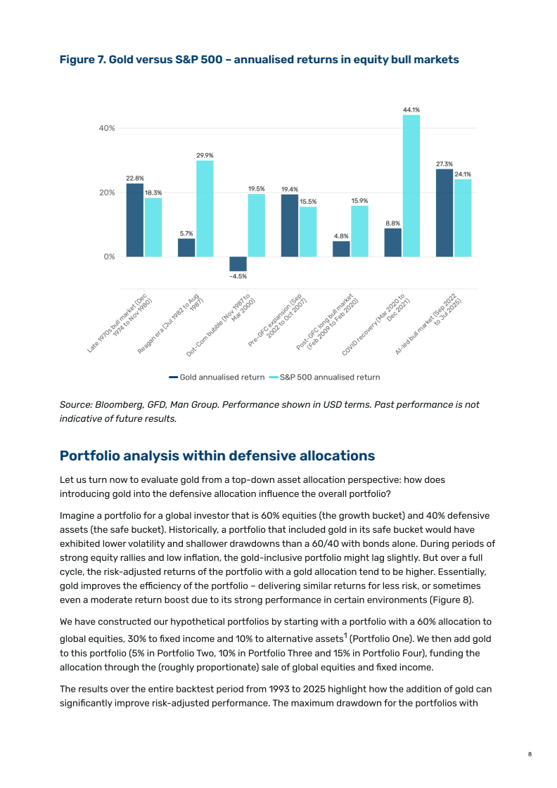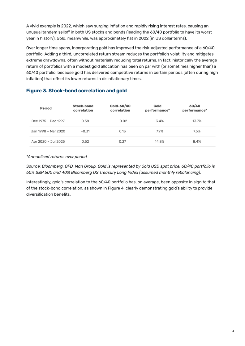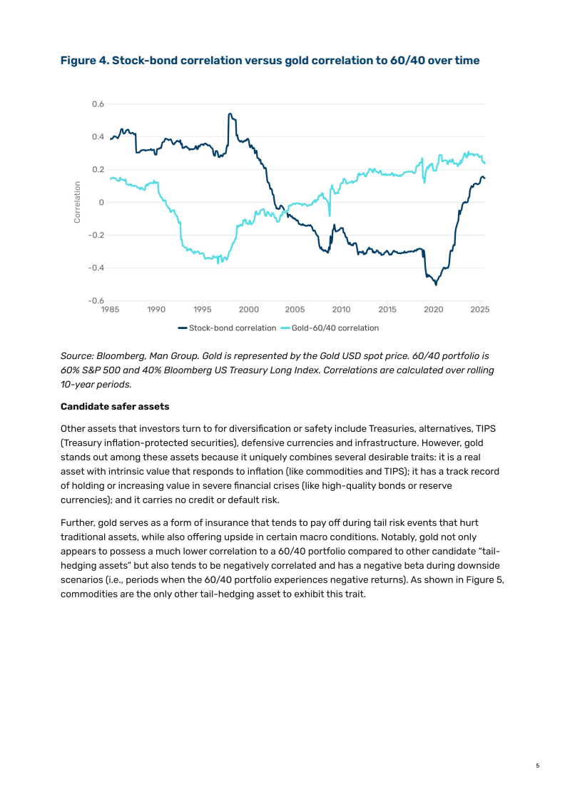 报告重点分析了黄金在传统60/40组合中的作用。当股票与债券呈正相关、组合同时承压时,黄金往往成为少数仍能提供正向或稳定回报的资产。2022年即是典型案例,美股与美债同步下跌,60/40组合创下历史最差表现,而黄金以美元计价基本持平,有效缓冲了组合回撤。