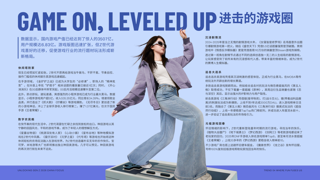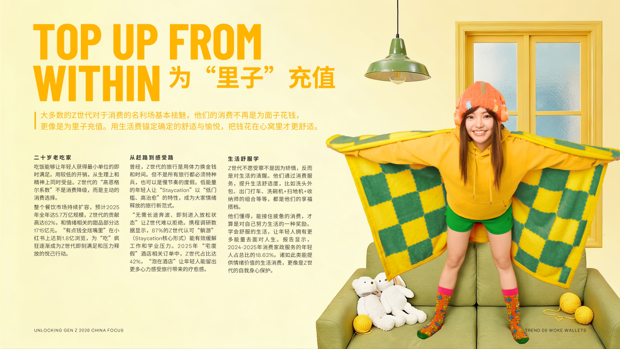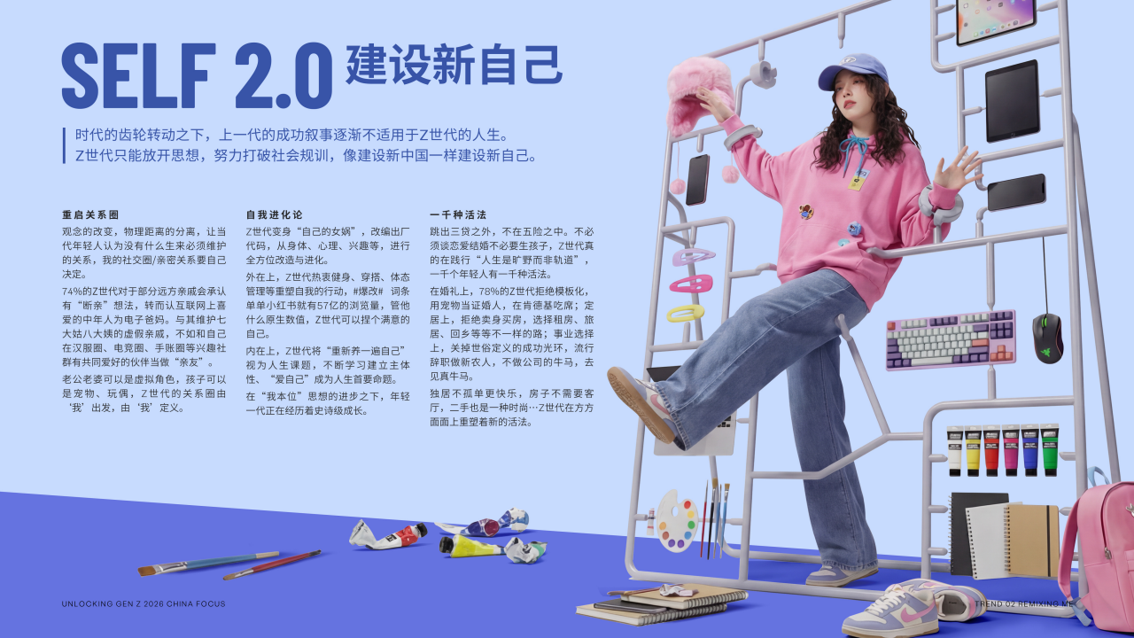 基于《2026年Z趋势报告:清醒的一代》所呈现的数据与案例,可以清晰看到,Z世代正在从“被塑造的一代”转向“自我定义的一代”。报告显示,超过七成Z世代认为“清楚知道自己不想要什么”比“明确成功标准”更重要。这种价值排序的变化,使得人生路径不再围绕单一上升通道展开,而是呈现去中心化与多轨并行特征,直接冲击传统教育、就业与消费体系。