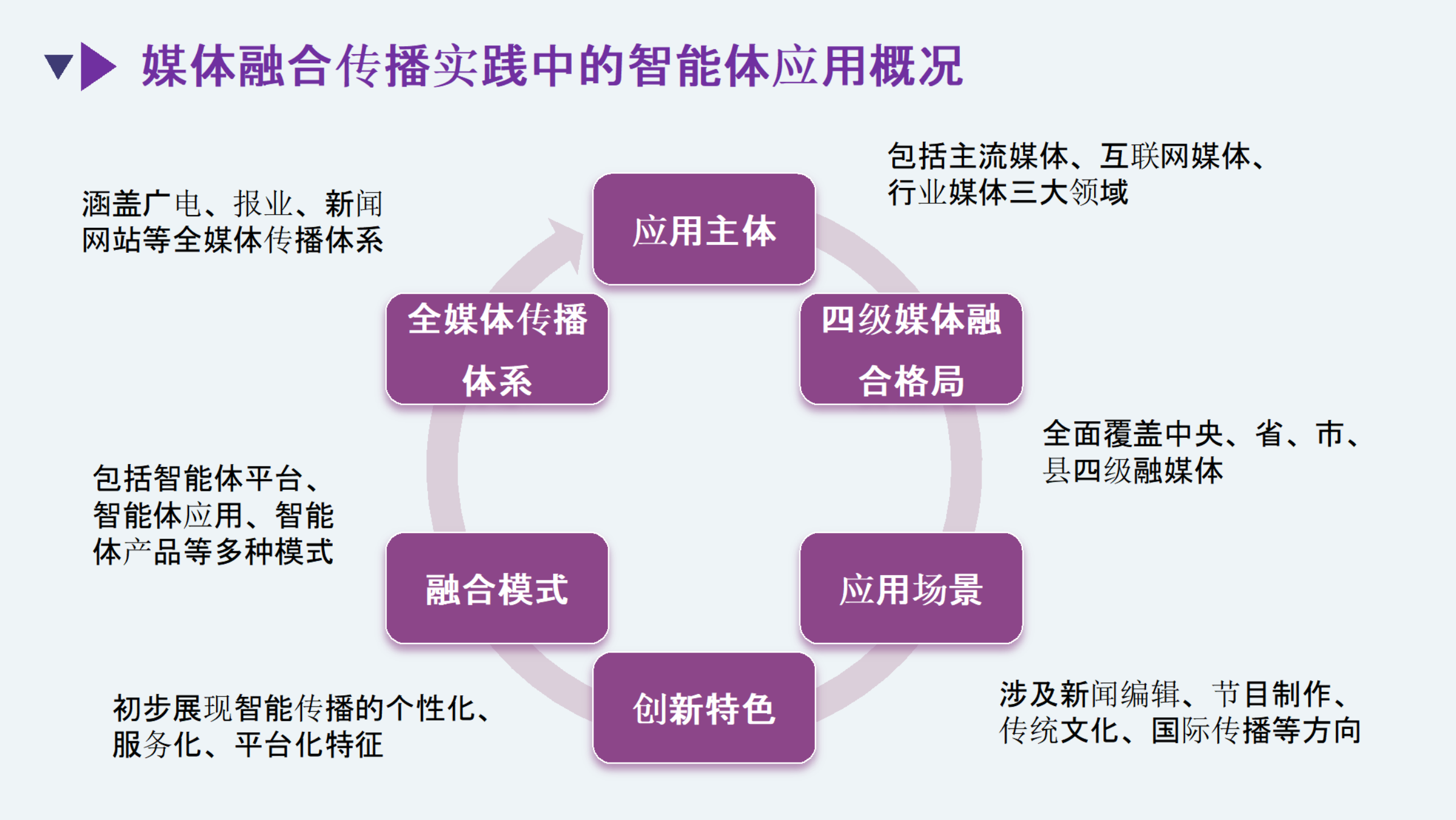 本报告主要包括六部分内容。第一部分立足时代背景,分析“人工智能+”行动下智能体作为新兴媒介的发展环境;第二部分梳理技术定义,明确智能体的概念界定、核心要素及其重要特征;第三部分着重讨论“融合”,逐一阐述智能体与传播融合的内涵、表现、结果、进程与愿景;第四部分聚焦全媒体传播体系中多元行动主体的应用实践,结合主流媒体机构和微博等互联网媒体平台开展的智能体典型案例,分析应用模式和创新方向;第五部分研判智能体对传播的影响,提出智能体将推进人机交互从“点触”向“问答”转变,促使媒介终端向“万物Agent”发展,以及重构社交关系,迁移信息入口等九个方面的变革;最后,由各领域专家对智能体传播未来趋势提出思考和展望。