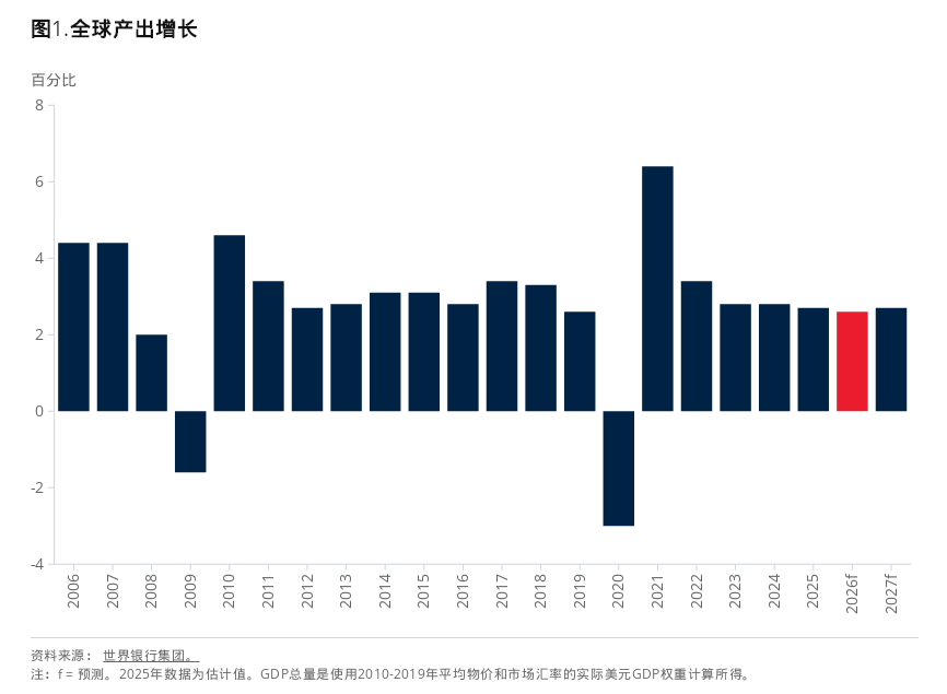 预计2026年全球经济增速将放缓至2.6%,因为多个支持性因素减弱,让位于贸易商品需求下降和主要经济体内需趋软。到2027年,由于先前的货币宽松政策支撑了内需,而且在不确定性下降的情况下贸易逐渐得到恢复,预计经济增速将回升至2.7%。