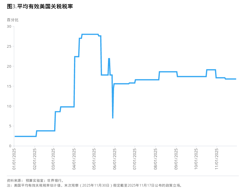 美国关税政策调整后,预计2025年下半年的平均实际关税率将攀升至约17%,创下自1930年以来的新高。这一数值与6月份的预测基本吻合,但较4月中旬预期的最高点仍有显著差距。在2025年关税政策调整前夕,美国进口商品曾出现短暂激增,但随后便呈现显著回落态势,特别是来自高关税国家的进口量下滑最为明显。据预测,受前期囤货效应减弱影响,2026年全球贸易增速或将由2025年的3.4%降至2.2%,涵盖货物与服务贸易的整体增长都将趋缓。