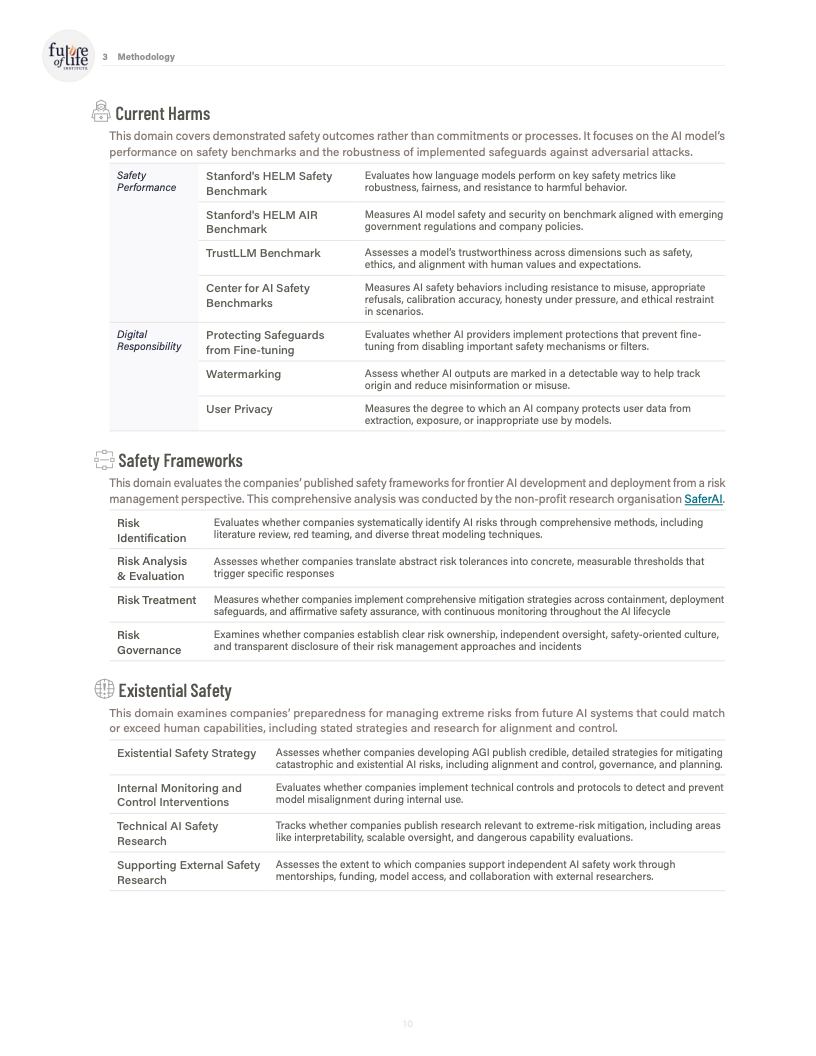 在生存性风险与长期安全方面,连续两期评估中,没有任何公司在该维度获得高于 D 的评分。尽管部分企业高层开始更频繁地公开讨论灾难性风险,但这些表态尚未转化为可量化的安全目标、清晰的触发阈值或有效的内部监控与控制机制。能力雄心与风险治理之间的落差依旧显著。
