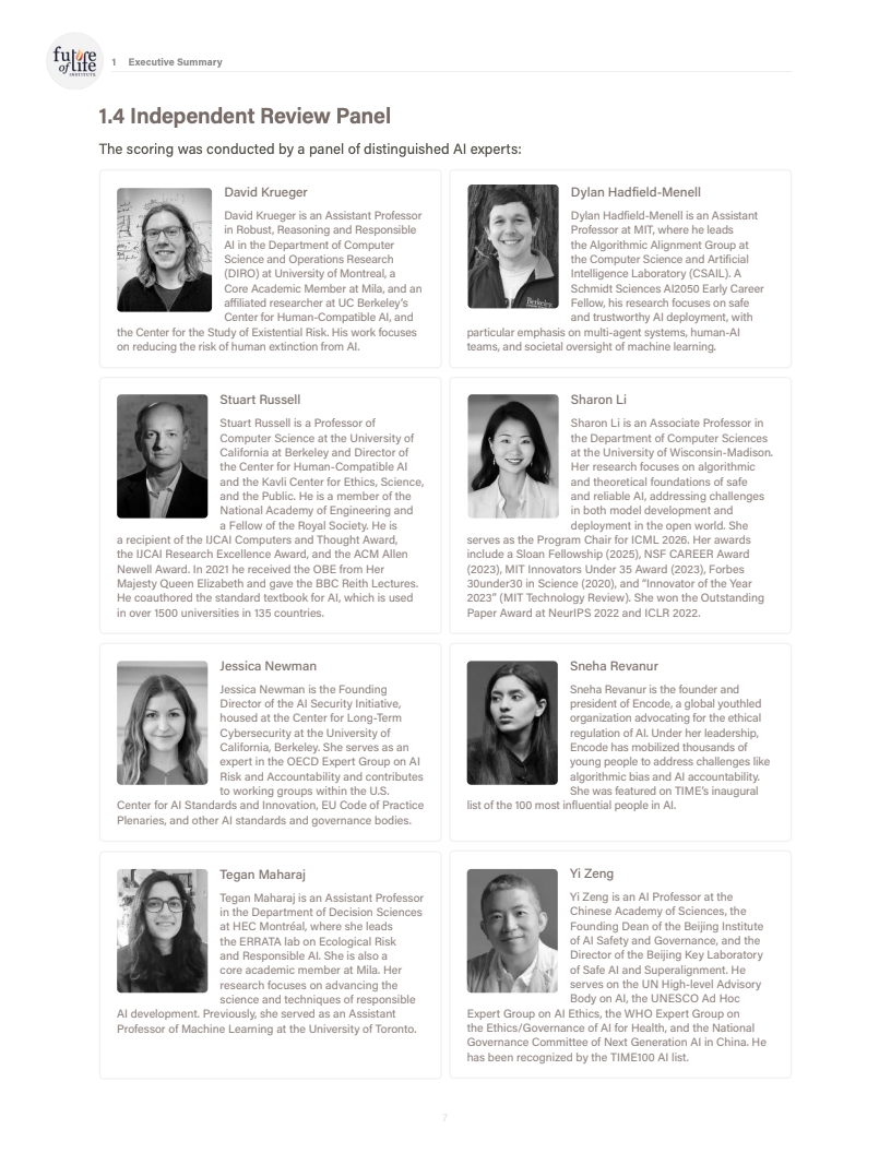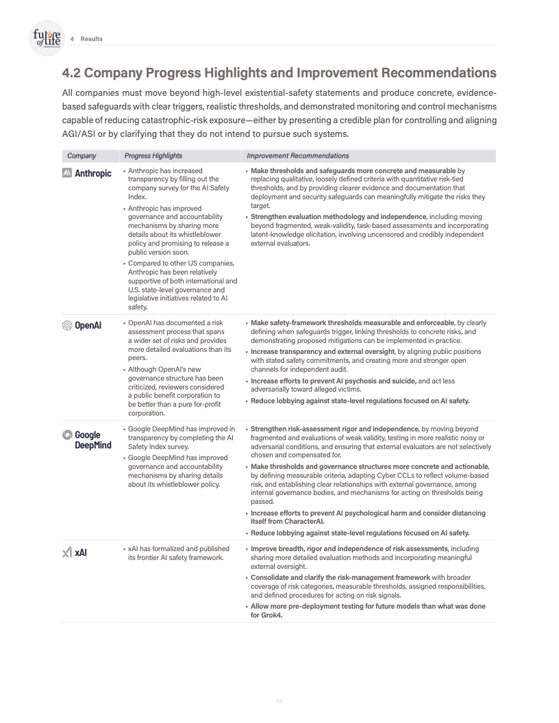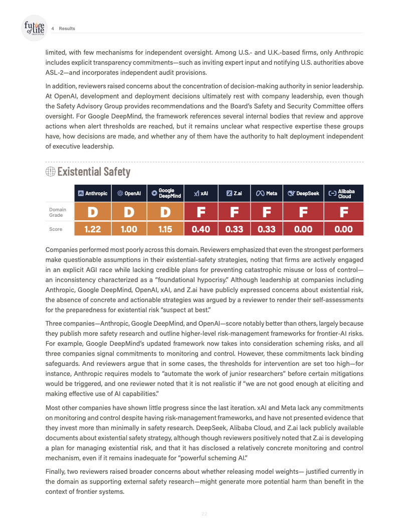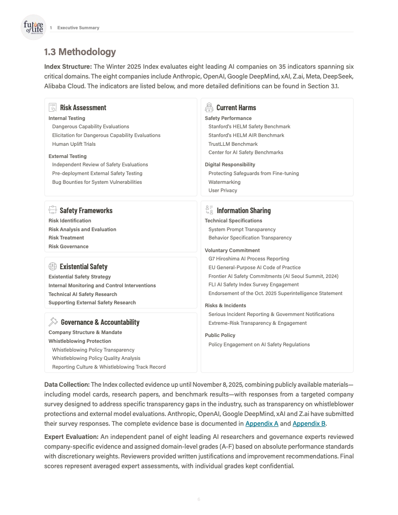 由未来生命研究所发布的《AI Safety Index 2025》对全球八家处于能力前沿的人工智能公司进行了系统性评估,覆盖风险评估、现实危害、安全框架、生存性风险、治理与问责以及信息披露六大维度,共计三十余项指标。评估结果显示,行业整体安全治理水平明显滞后于模型能力的跃迁速度,结构性缺口正在扩大。