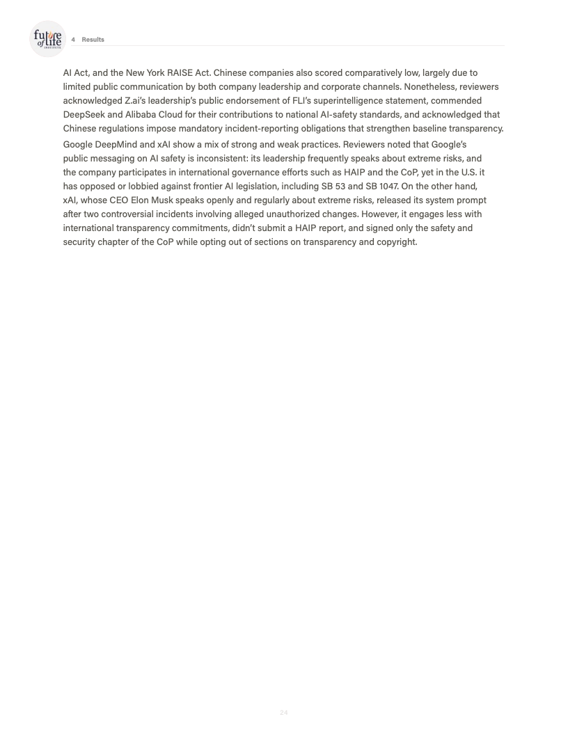 第二梯队由 xAI、Z.ai、Meta、DeepSeek 与阿里云构成,与前三名之间存在明显断层。多数公司在风险评估披露、安全框架完整性及治理机制方面仍存在基础性不足,尤其是在举报人保护制度、外部独立评估和量化风险阈值方面。尽管如此,xAI 与 Z.ai 在本轮中披露了更多内部风险评估流程,显示出一定改善迹象。