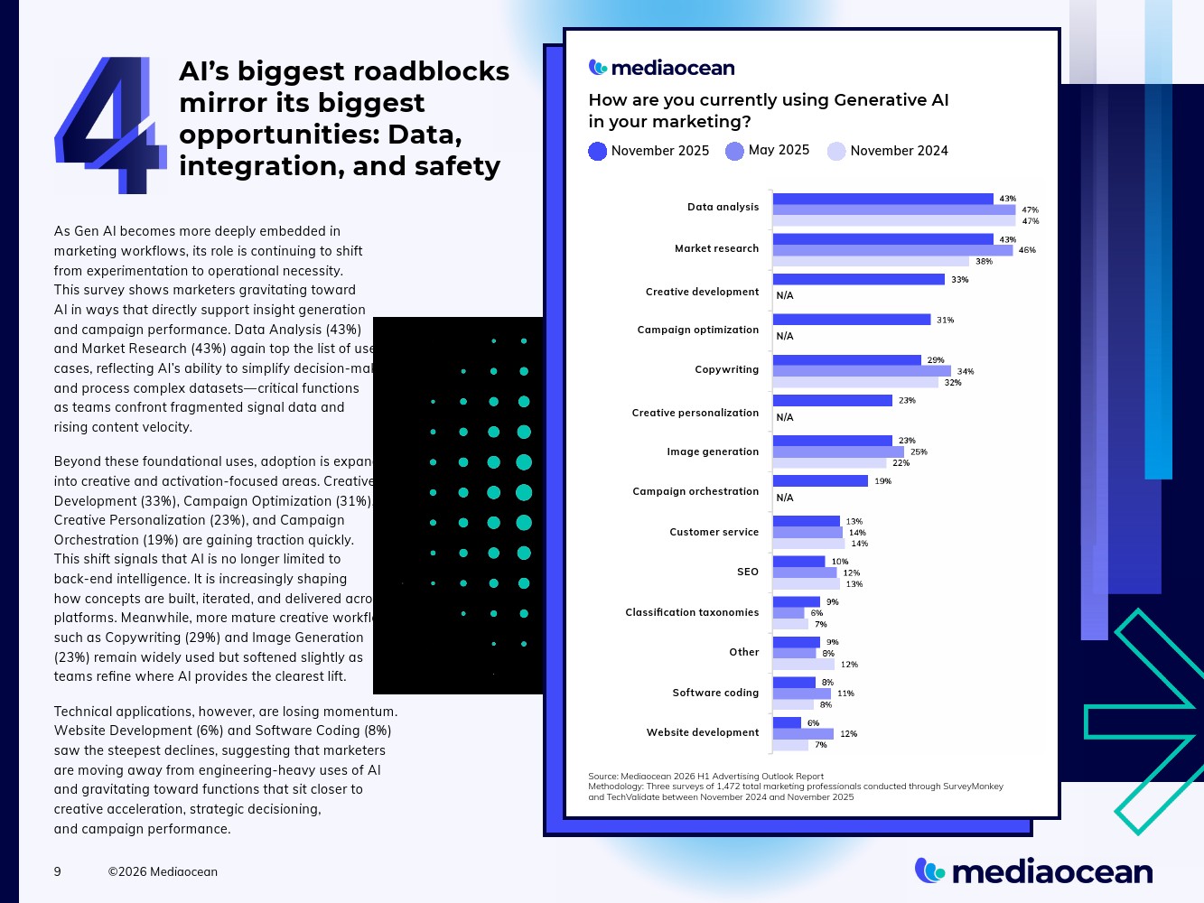 随着生成式AI更深地融入营销工作流程,其角色正持续从实验性尝试转向运营必需品。本次调研显示,营销人员正朝着能直接支持洞察生成绩效的AI应用方向靠拢。数据分析(43%)与市场研究(43%)再次位列应用场景榜首,这反映了AI在简化决策与处理复杂数据集方面的能力——对于团队应对碎片化的信号数据与不断加快的内容节奏而言,这些功能至关重要。
