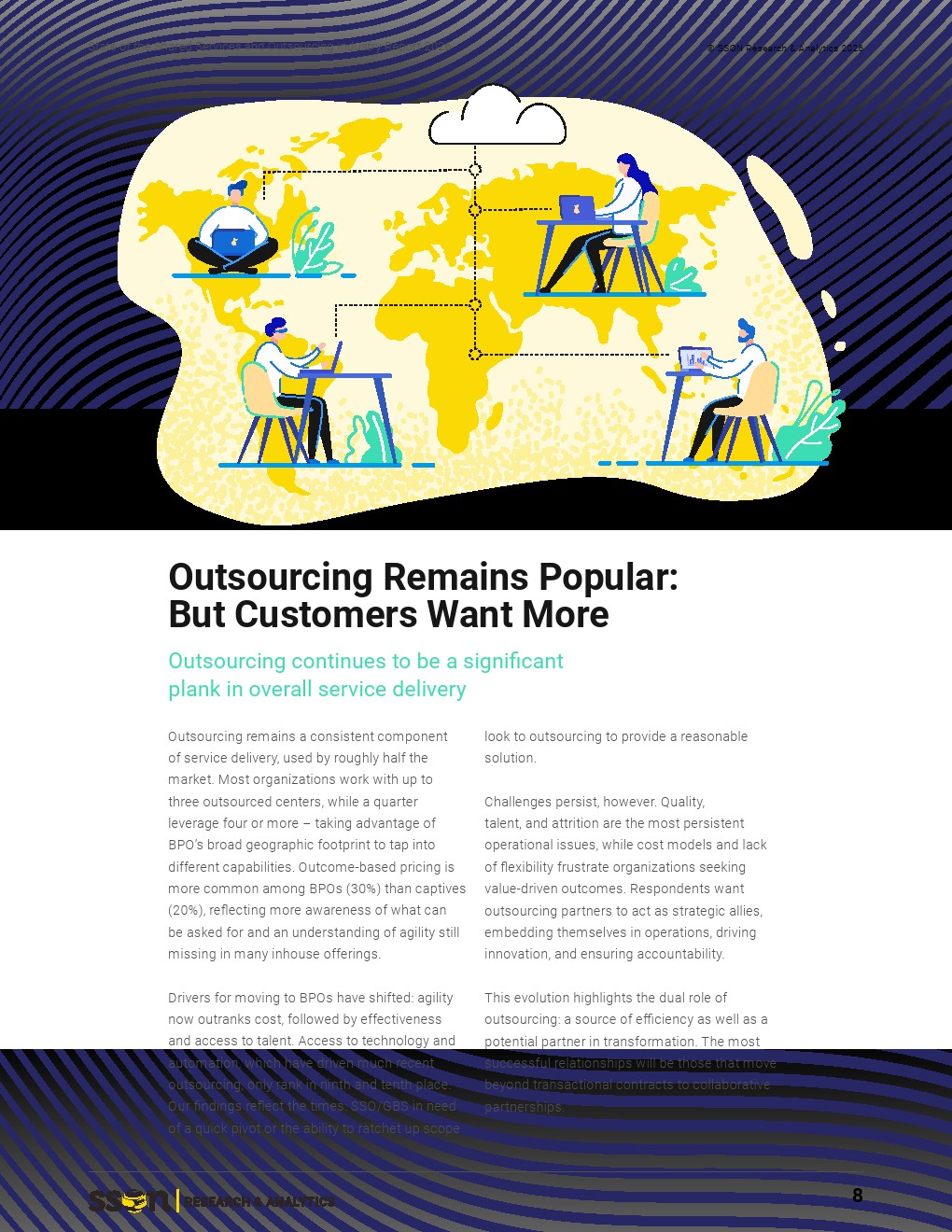 外包仍是服务交付中一个稳定的组成部分,约半数市场参与者采用。大多数组织与最多三个外包中心合作,而1/4的组织利用四个或更多——充分利用业务流程外包(BPO)广泛的地理布局来获取不同的能力。基于结果的定价在BPO中(30%)比在自营中心(20%)更为常见,这反映出客户对外包所能提供价值的认知更为清晰,以及对敏捷性的理解——这仍是许多内部服务所缺乏的。