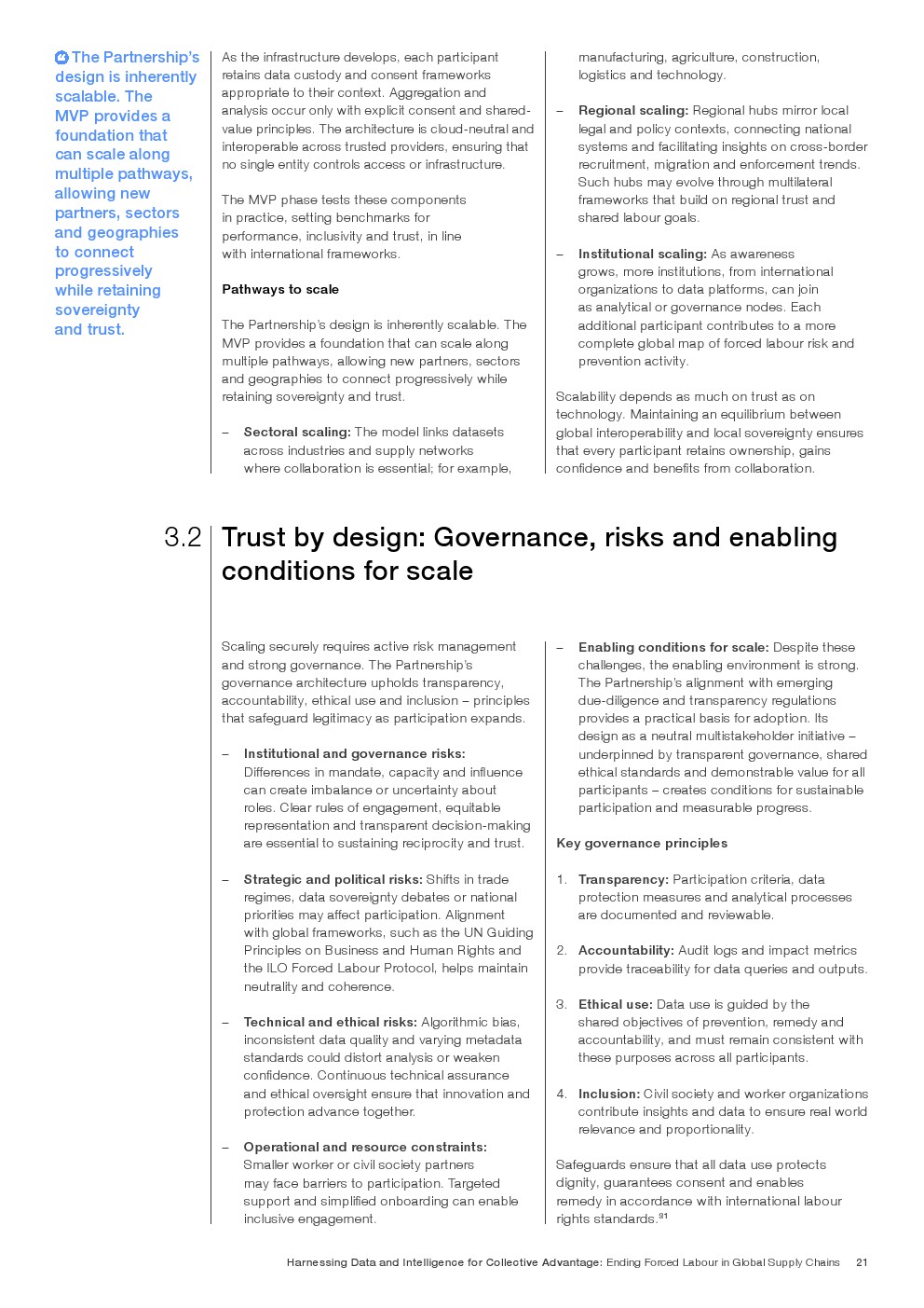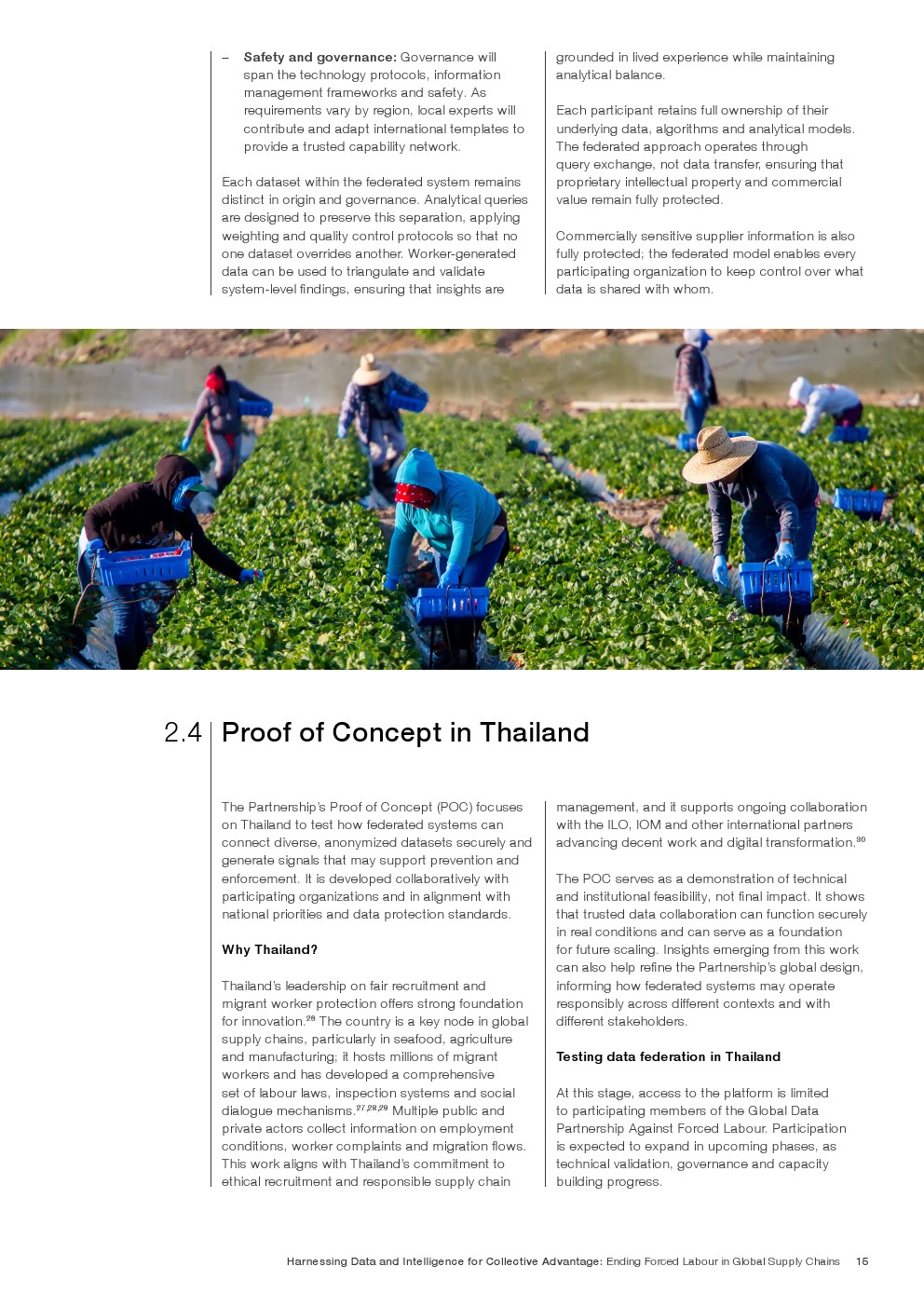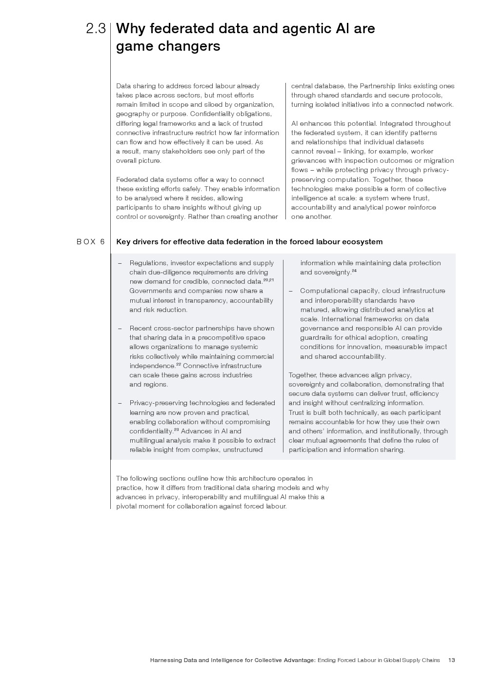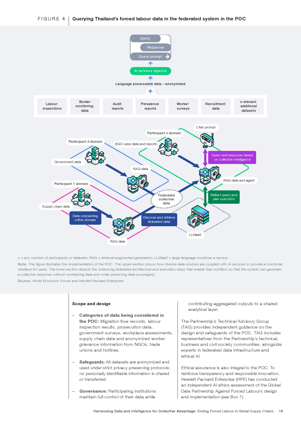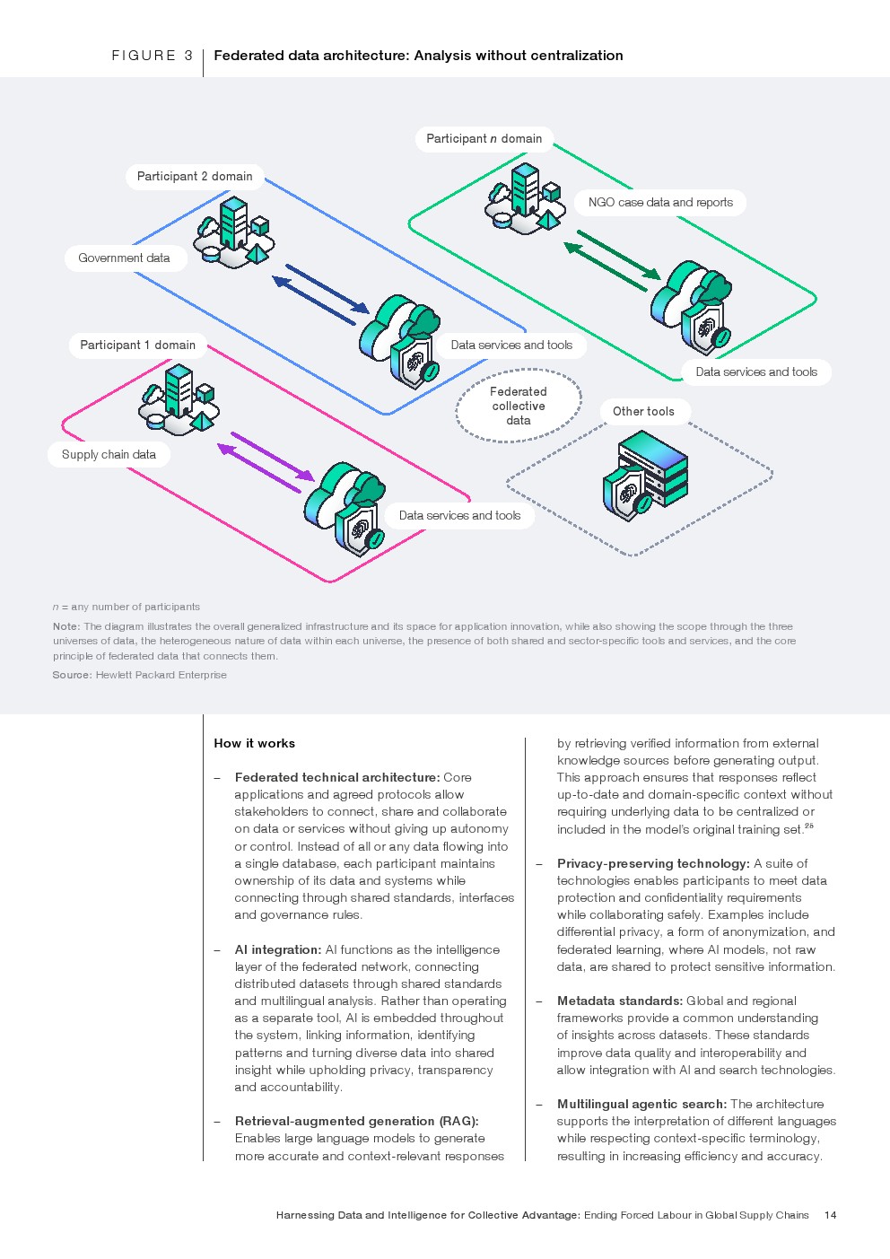 全球反强迫劳动数据合作伙伴关系应运而生,旨在打破这一循环。该伙伴关系于2025年启动,提供了一个可信赖的、竞争前的基础设施,使政府、企业、国际组织和民间社会团体能够安全协作,而无需转移、集中或放弃底层数据的主权。该伙伴关系基于联邦化模型构建,通过共享标准和治理协议连接现有系统,允许参与方在保留对自身数据控制权的同时,生成集体智能。联邦化架构和智能体人工智能是该架构的核心,支持在数据所在地进行分析,并链接来自不同来源的信号——例如劳工申诉、劳动监察、招聘记录和人口流动——以发现传统可追溯性方法无法洞察的风险模式。